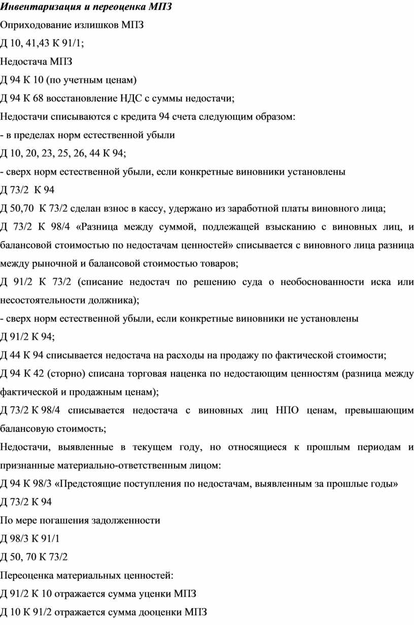 Д 73/2 К 98/4 списывается недостача с виновных лиц НПО ценам, превышающим балансовую стоимость;
