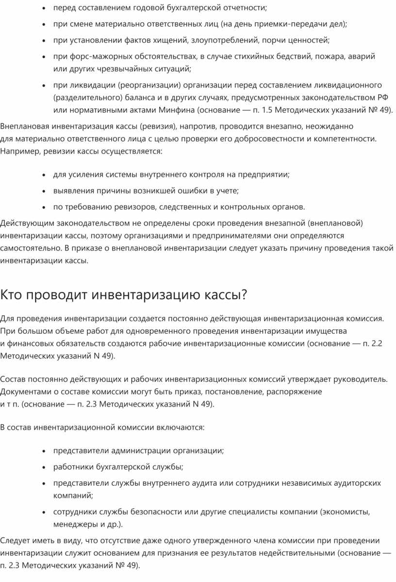 · при ликвидации (реорганизации) организации перед составлением ликвидационного (разделительного) баланса и в других случаях, предусмотренных законодательством РФ или нормативными актами Минфина (основание — п. 1.5 Методических указаний № 49).