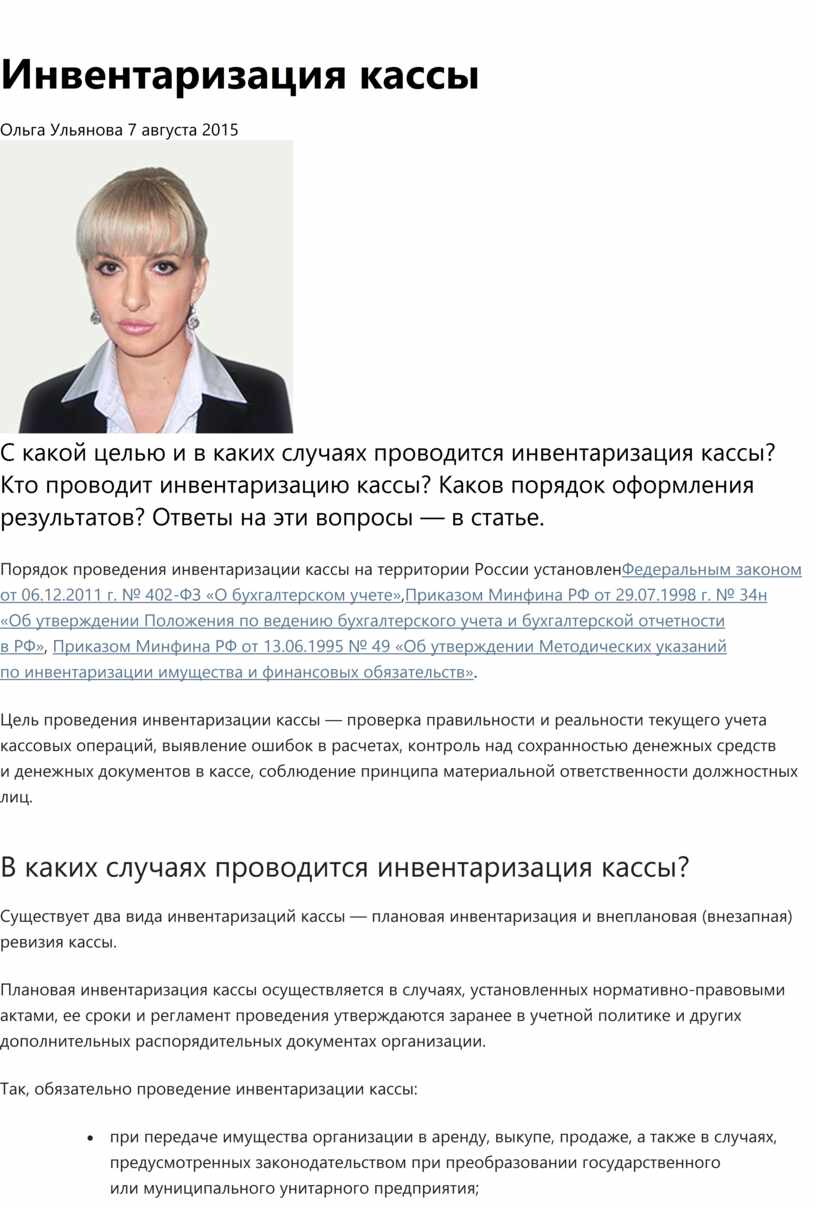 Порядок проведения инвентаризации кассы на территории России установленФедеральным законом от 06.12.2011 г. № 402-ФЗ «О бухгалтерском учете»,Приказом Минфина РФ от 29.07.1998 г. № 34н «Об утверждении Положения по ведению бухгалтерского учета и бухгалтерской отчетности в РФ», Приказом Минфина РФ от 13.06.1995 № 49 «Об утверждении Методических указаний по инвентаризации имущества и финансовых обязательств».