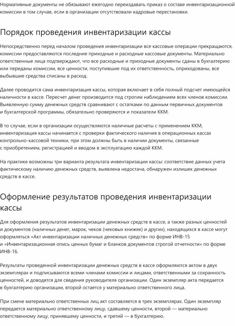 · Процедуру инвентаризации кассы проводит комиссия, назначенная руководителем организации. Для этого издается приказ или распоряжение. Как правило, в такую комиссию входят бухгалтера, аудиторы, руководители компании.