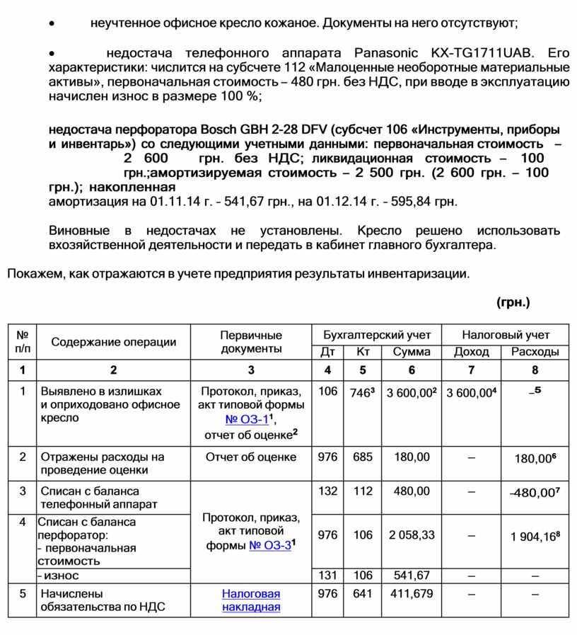 1 Утверждена Приказом № 352. 2 Оценка проведена субъектом оценочной деятельности (п. 17 разд. II Положения № 158). 3 Согласно Письму № 3776 и п. 21 приложения к Методрекомендациям № 561. 4 Стоимость кресла включена в состав прочих доходов (пп. 135.5.15 НК) и отражается в стр. 03.30 приложения IД к Налоговой декларации по налогу на прибыль предприятия по форме, утвержденной Приказом № 872 (далее – декларация). 5 В бухгалтерском учете стоимость кресла начнет амортизироваться начиная с декабря 2014 года (п. 29 П(С)БУ 7), в налоговом она не подлежит амортизации, так как предприятие не понесло расходов для его приобретения (создания) (п. 144.1 НК). 6 Включается в состав прочих расходов хоздеятельности (пп. «ж» пп. 138.10.2 НК) и отражается в стр. 06.1 декларации. 7 Телефон относится к МНМА и с точки зрения пп. 14.1.138 НК не является ОС (его стоимость не превышает 2 500 грн.). Поэтому формально к его недостаче нельзя применить норму п. 146.16 НК о ликвидации ОС и безопаснее воспользоваться фискальным подходом: сумму амортизации телефона, ранее включенную в расходы, при его пропаже исключить из расходов, поскольку объект перестал использоваться в хоздеятельности. В декларации сумма амортизации телефона уменьшит сумму расходов в стр. 06.1. По той же причине (неиспользование в хоздеятельности) согласно п. 198.5 НК нужно начислить налоговые обязательства по НДС исходя из базы налогообложения, определенной в соответствии с п. 189.1 НК. К счастью, в этой норме говорится не об ОС, а о необоротных активах, к которым, без сомнения, относятся МНМА. Поэтому базой обложения НДС в данном случае будет балансовая стоимость пропавшего МНМА, т. е. 0 (обязательства не начисляются). 8 В случае недостачи ОС можно воспользоваться нормой п. 146.16 НК о ликвидации ОС и увеличить расходы на сумму амортизируемой стоимости пропавшего объекта за вычетом накопленной амортизации. Начисление амортизации объекта ОС прекращается с месяца, следующего за выводом такого объекта из эксплуатации вследствие его недостачи (п. 146.15, 146.18 НК). Таким образом, месяц проведения инвентаризации (ноябрь) будет последним месяцем |