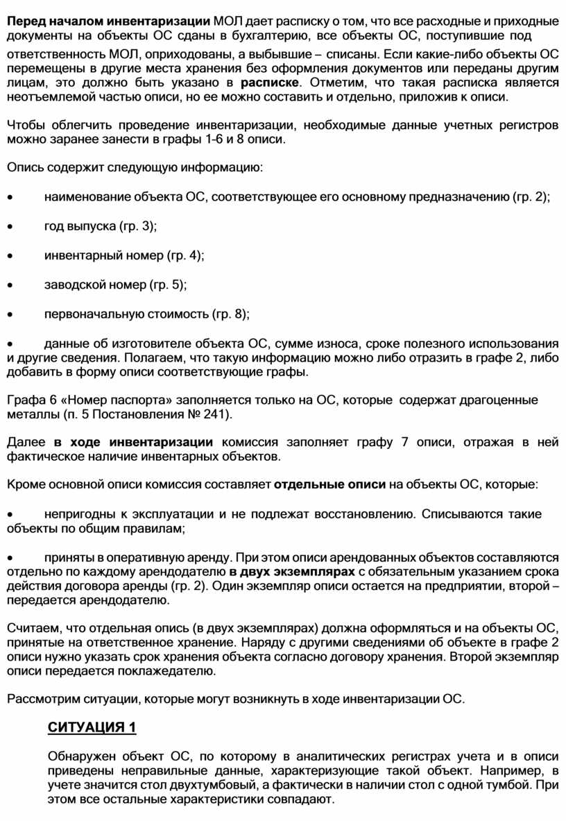 ответственность МОЛ, оприходованы, а выбывшие – списаны. Если какие-либо объекты ОС перемещены в другие места хранения без оформления документов или переданы другим лицам, это должно быть указано в расписке. Отметим, что такая расписка является неотъемлемой частью описи, но ее можно составить и отдельно, приложив к описи.