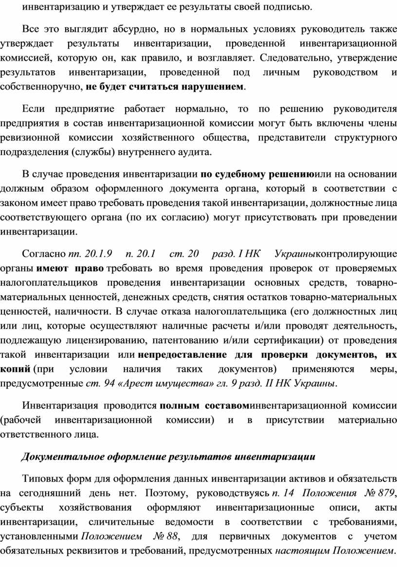 Как и ранее для проведения инвентаризации должна быть создана инвентаризационная комиссия из представителей аппарата управления предприятия, бухгалтерской службы[2](представителей аудиторской фирмы, централизованной бухгалтерии, субъекта предпринимательской деятельности — физического лица, которое осуществляет ведение бухгалтерского учета на предприятии на договорных началах) и опытных работников предприятия, которые знают объект инвентаризации, цены и первичный учет (инженеры, технологи, механики, производители работ, товароведы, экономисты, бухгалтеры). Инвентаризационную комиссию возглавляет руководитель предприятия (его заместитель) или руководитель структурного подразделения, уполномоченный руководителем предприятия. Если предприятие временно не работает, то может сложиться ситуация, когда инвентаризацию проводить некому, кроме руководителя. Что же делать, если члены постоянно действующей инвентаризационной комиссии уже уволены? В этом случае инвентаризацию будут проводить те, кто остался, например, руководитель и главный бухгалтер. Если же и главного бухгалтера нет, то формально инвентаризацию должен проводить руководитель. В тех случаях, когда бухгалтерский учет ведется непосредственно руководителем предприятия, инвентаризационную комиссию возглавляет руководитель предприятия самостоятельно (абзац 2 п. 1 разд. II Положения № 879). Такой руководитель утверждает приказом измененный состав инвентаризационной комиссии (в лице себя самого), затем проводит инвентаризацию и утверждает ее результаты своей подписью. Все это выглядит абсурдно, но в нормальных условиях руководитель также утверждает результаты инвентаризации, проведенной инвентаризационной комиссией, которую он, как правило, и возглавляет. Следовательно, утверждение результатов инвентаризации, проведенной под личным руководством и собственноручно, не будет считаться нарушением. Если предприятие работает нормально, то по решению руководителя предприятия в состав инвентаризационной комиссии могут быть включены члены ревизионной комиссии хозяйственного общества, представители структурного подразделения (службы) внутреннего аудита. В случае проведения инвентаризации по судебному решению или на основании должным образом оформленного документа органа, который в соответствии с законом имеет право требовать проведения такой инвентаризации, должностные лица соответствующего органа (по их согласию) могут присутствовать при проведении инвентаризации. Согласно пп. 20.1.9 п. 20.1 ст. 20 разд. I НК Украины контролирующие органы имеют право требовать во время проведения проверок от проверяемых налогоплательщиков проведения инвентаризации основных средств, товарно-материальных ценностей, денежных средств, снятия остатков товарно-материальных ценностей, наличности. В случае отказа налогоплательщика (его должностных лиц или лиц, которые осуществляют наличные расчеты и/или проводят деятельность, подлежащую лицензированию, патентованию и/или сертификации) от проведения такой инвентаризации или непредоставление для проверки документов, их копий (при условии наличия таких документов) применяются меры, предусмотренные ст. 94 «Арест имущества» гл. 9 разд. II НК Украины. Инвентаризация проводится полным составом инвентаризационной комиссии (раб