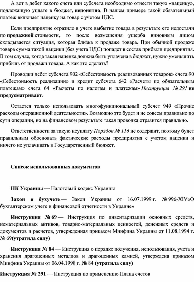 Взаимный зачет излишков и недостач в результате пересортицы допускается только в отношении запасов одинакового наименования и в тождественном количестве при условии, что излишки и недостачи образовались за один и тот же проверяемый период и у одного и того же материально ответственного лица (п. 5 разд. IV Положения № 879). Министерства, другие органы исполнительной власти, к сфере управления которых относятся предприятия, могут устанавливать порядок, согласно которому такой зачет может быть допущен относительно одной и той же группе запасов, если ценности, входящие в ее состав, имеют сходство по внешнему виду или упакованы в одинаковую тару (при отпуске их без распаковки тары). В случае взаимозачета недостач и излишков в результате пересортицы, когда стоимость запасов, оказавшихся в недостаче, больше стоимости запасов, оказавшихся в излишке, разница стоимости должна быть отнесена на виновных лиц. Если лица, виновные в пересортице не установлены, то суммовые разницы рассматриваются как недостачи ценностей сверх нормы естественной убыли с отнесением их в состав расходов в порядке, определенном п. 4 разд. IV Положения № 879. По таким суммовым разницам в протоколах инвентаризационной комиссии должны быть указаны причины, по которым разницы не могут быть отнесены на виновных лиц (абзац 4 п. 5 разд. IV Положения № 879). Превышение стоимости запасов, оказавшихся в излишке, по сравнению со стоимостью запасов, оказавшихся в недостаче вследствие пересортицы, относится на увеличение данных учета соответствующих запасов и доходов в порядке, определенном п. 4 разд. IV Положения № 879. Относительно того, как отразить такой обязательный платеж в бухгалтерском учете, нормативные акты ответа не дают. Известно только одно, что обязательство по такому платежу необходимо учесть по кредиту субсчета 642 «Расчеты по обязательным платежам», на котором ведется учет расчетов по сборам (обязательным платежам), взимаемые в соответствии с действующим законодательством. А вот в дебет какого счета или субсчета необходимо отнести такую «наценку», подлежащую уплате в бюджет, непонятно. В нашем примере такой обязательный платеж включает наценку на товар с учетом НДС. Если предприятие отразило в учете выбытие товара в результате его недостачи по продажной стоимости, то после возмещения ущерба виновным лицом складывается ситуация, которая близка к продаже товара. При обычной продаже товара сумма такой наценки (без учета НДС) попадет в состав прибыли предприятия. В том случае, когда такая наценка должна быть уплачена в бюджет, нужно уменьшить прибыль от продажи товара. А как это сделать? Проводки дебет субсчета 902 «Себестоимость реализованных товаров» счета 90 «Себестоимость реализации» и кредит субсчета 642 «Расчеты по обязательным платежам» счета 64 «Расчеты по налогам и платежам» Инструкция № 291 не предусматривает. Остается только использовать многофункциональный субсчет 949 «Прочие расходы операционной деятельности». Возможно это будет и не совсем правильно по сути операции, но на финансовом результате такая проводка отразится правильно. Ответственности за такую неуплату Порядок № 116 не содержит, поэтому будет правильным обосновать фактические расходы предприятия с учетом наценки и ничего не уплачивать в Государственный бюджет.