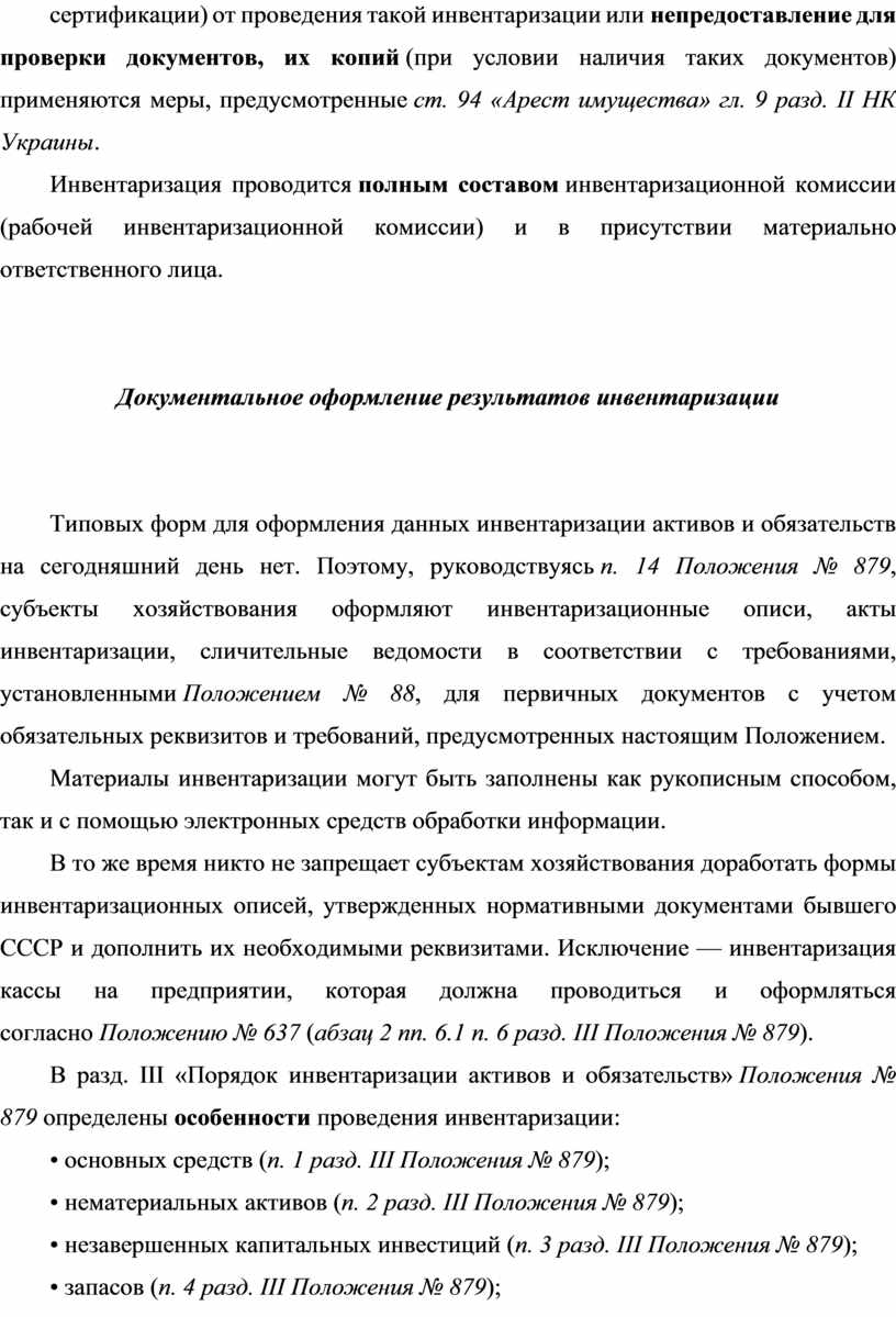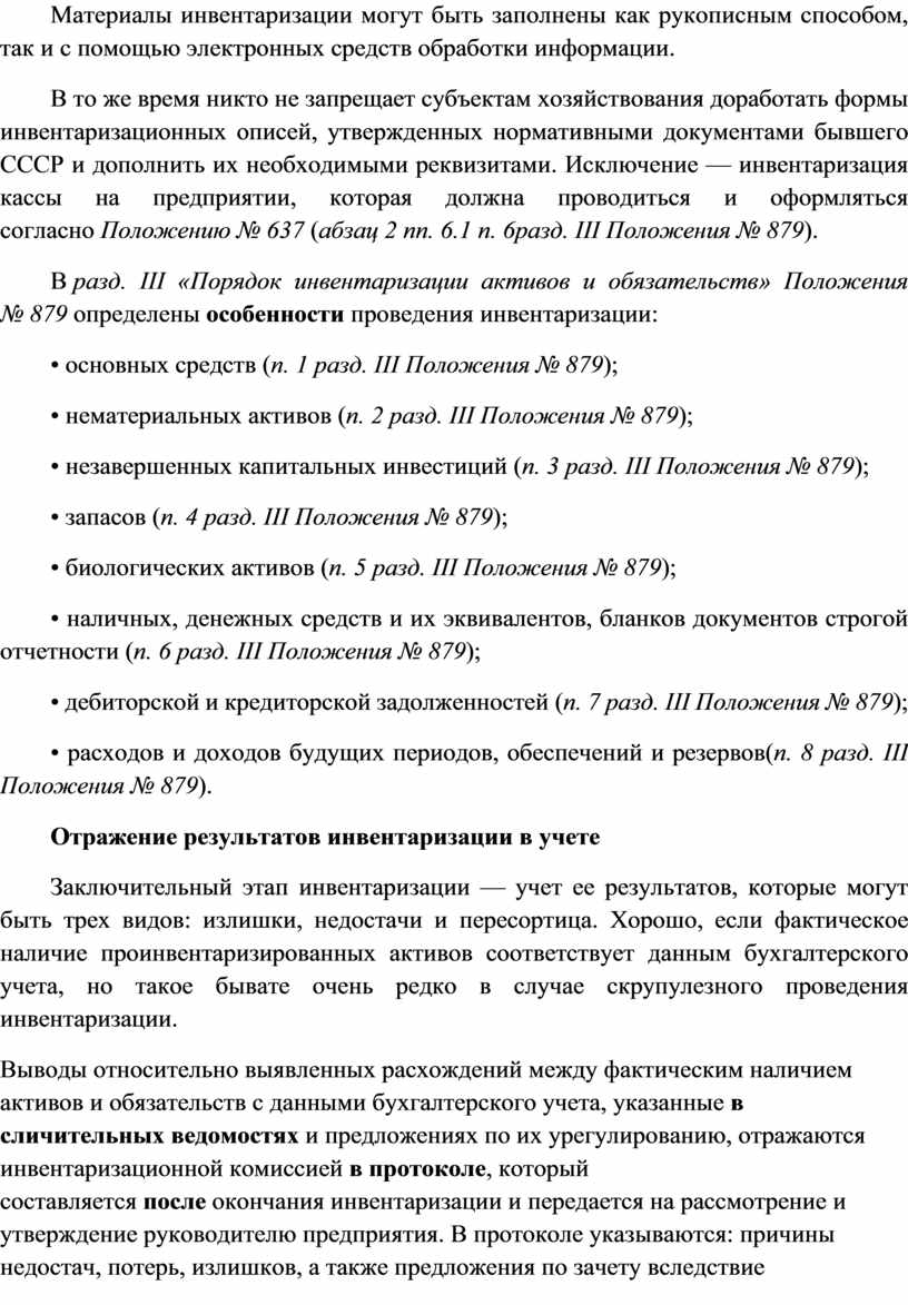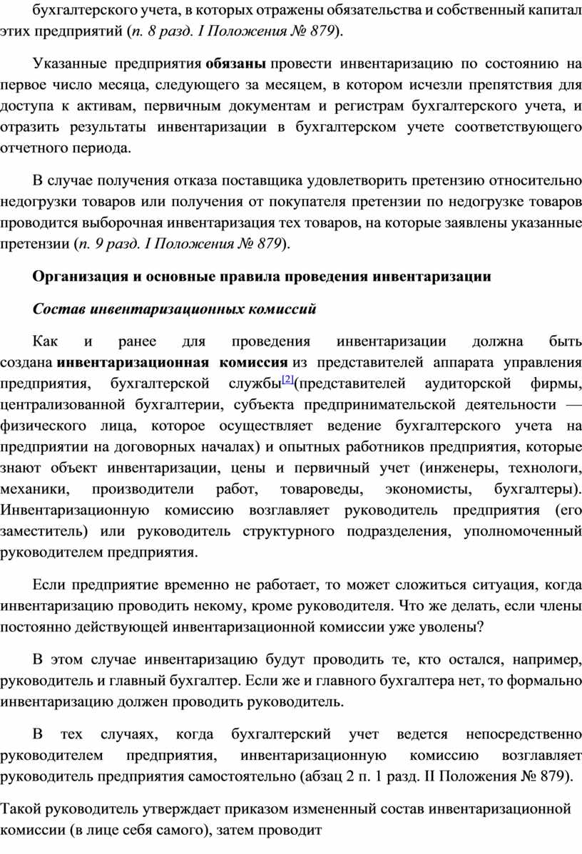 разд. I Положения № 879). Организация и основные правила проведения инвентаризации
