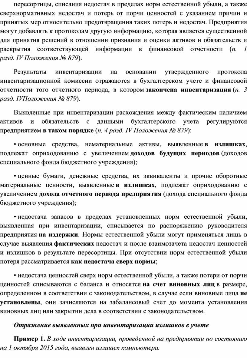 Заключительный этап инвентаризации — учет ее результатов, которые могут быть трех видов: излишки, недостачи и пересортица. Хорошо, если фактическое наличие проинвентаризированных активов соответствует данным бухгалтерского учета, но такое бывает очень редко в случае скрупулезного проведения инвентаризации. Выводы относительно выявленных расхождений между фактическим наличием активов и обязательств с данными бухгалтерского учета, указанные в сличительных ведомостях и предложениях по их урегулированию, отражаются инвентаризационной комиссией в протоколе, который составляется после окончания инвентаризации и передается на рассмотрение и утверждение руководителю предприятия. В протоколе указываются: причины недостач, потерь, излишков, а также предложения по зачету вследствие пересортицы, списания недостач в пределах норм естественной убыли, а также сверхнормативных недостач и потерь от порчи ценностей с указанием причин и принятых мер относительно предотвращения таких потерь и недостач. Предприятия могут добавлять к протоколам другую информацию, которая является существенной для принятия решений в отношении признания и оценки активов и обязательств и раскрытия соответствующей информации в финансовой отчетности (п. 1 разд. IV Положения № 879). Результаты инвентаризации на основании утвержденного протокола инвентаризационной комиссии отражаются в бухгалтерском учете и финансовой отчетности того отчетного периода, в котором закончена инвентаризация (п. 3 разд. IV Положения № 879). Выявленные при инвентаризации расхождения между фактическим наличием активов и обязательств с данными бухгалтерского учета регулируются предприятием в таком порядке (п. 4 разд. IV Положения № 879): • основные средства, нематериальные активы, выявленные в излишках, подлежат оприходованию с увеличением доходов будущих периодов (доходов специального фонда бюджетного учреждения); • ценные бумаги, денежные средства, их эквиваленты и прочие оборотные материальные ценности, выявленные в излишках, подлежат оприходованию с увеличением дохода отчетного периода предприятия (дохода специального фонда бюджетного учреждения); • недостача запасов в пределах установленных норм естественной убыли, выявленная при инвентаризации, списывается по распоряжению руководителя предприятия на издержки. Нормы естественной убыли могут применяться лишь в случае выявления фактических недостач и после взаимозачета недостач ценностей и излишков в результате пересортицы. При отсутствии норм естественной убыли потеря рассматривается как недостача сверх нормы; • недостача ценностей