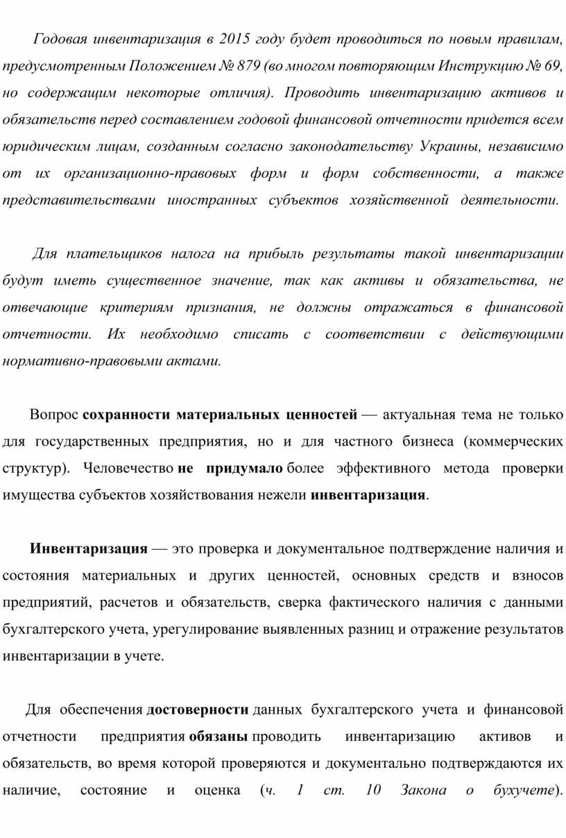 Годовая инвентаризация в 2015 году будет проводиться по новым правилам, предусмотренным Положением № 879 (во многом повторяющим Инструкцию № 69, но содержащим некоторые отличия). Проводить инвентаризацию активов и обязательств перед составлением годовой финансовой отчетности придется всем юридическим лицам, созданным согласно законодательству Украины, независимо от их организационно-правовых форм и форм собственности, а также представительствами иностранных субъектов хозяйственной деятельности.