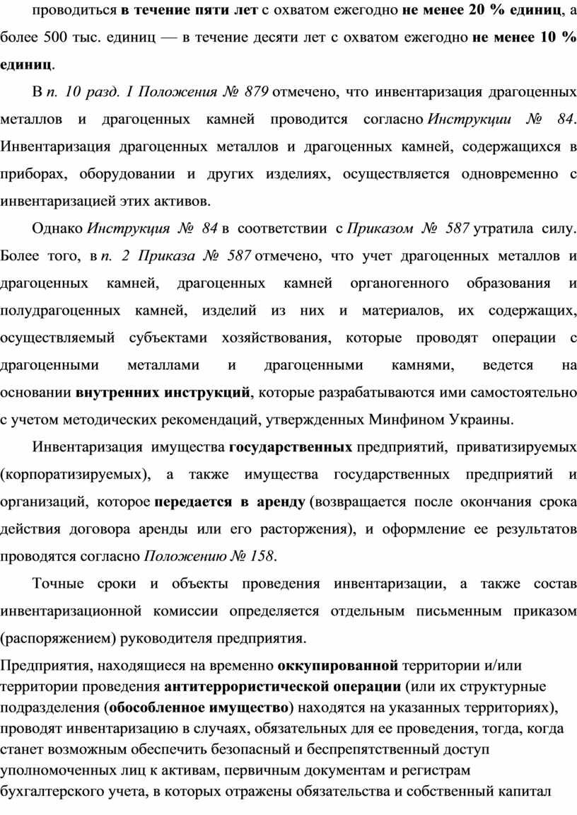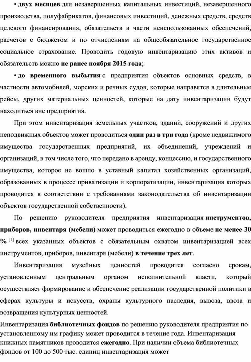 • трех месяцев для необоротных активов (кроме незавершенных капитальных инвестиций, объектов основных средств, которые на момент инвентаризации будут находиться вне предприятия, в частности автомобилей, морских и речных судов, направленных в длительные рейсы, и тому подобное), запасов (кроме незавершенного производства и полуфабрикатов, других материальных ценностей, которые в момент инвентаризации будут находиться вне предприятия), текущих биологических активов, дебиторской и кредиторской задолженностей, расходов и доходов будущих периодов, обязательств (кроме неиспользованных обеспечений, расчетов с бюджетом и по отчислениям на общеобязательное государственное социальное страхование). Проводить годовую инвентаризацию этих активов и обязательств можно не ранее октября 2015 года; • двух месяцев для незавершенных капитальных инвестиций, незавершенного производства, полуфабрикатов, финансовых инвестиций, денежных средств, средств целевого финансирования, обязательств в части неиспользованных обеспечений, расчетов с бюджетом и по отчислениям на общеобязательное государственное социальное страхование. Проводить годовую инвентаризацию этих активов и обязательств можно не ранее ноября 2015 года; • до временного выбытия с предприятия объектов основных средств, в частности автомобилей, морских и речных судов, которые направятся в длительные рейсы, других материальных ценностей, которые на дату инвентаризации будут находиться вне предприятия. При этом инвентаризация земельных участков, зданий, сооружений и других неподвижных объектов может проводиться один раз в три года (кроме недвижимого имущества государственных предприятий, их объединений, учреждений и организаций, в том числе того, что передано в аренду, концессию, и государственного имущества, которое не вошло в уставный капитал хозяйственных организаций, образованных в процессе приватизации и корпоратизации, инвентаризация которых проводится в соответствии с требованиями законодательства об инвентаризации объектов государственной собственности). По решению руководителя предприятия инвентаризация инструментов, приборов, инвентаря (мебели) может проводиться ежегодно в объеме не менее 30 % [1] всех указанных объектов с обязательным охватом инвентаризацией всех инструментов, приборов, инвентаря (мебели) в течение трех лет. Инвентаризация музейных ценностей проводится согласно срокам, установленным центральным органом исполнительной власти, который осуществляет формирование и обеспечение реализации государственной политики в сферах культуры и искусств, охраны культурного наследия, вывоза, ввоза и возвращения культурных ценностей. Инвентаризация библиотечных фондов по решению руководителя предприятия по установленному им графику может проводится в течение года. Инвентаризация книжных памятников проводится ежегодно. При наличии объема библиотечных фондов от 100 до 500 тыс. единиц инвентаризация может проводиться в течение пяти лет с охватом ежегодно не менее 20 % единиц, а более 500 тыс. единиц — в течение десяти лет с охватом ежегодно не менее 10 % единиц. В п. 10 разд. I Положения № 879 отмечено, что инвентаризация драгоценных металлов и драгоценных камней проводится согласно Инструкции № 84. Инвентаризация драгоценных металлов и драгоценных камней, 