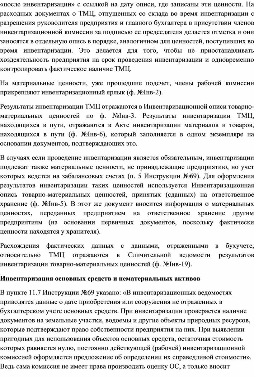 В соответствии с п. 11.8 Инструкции №69 при инвентаризации ТМЦ их перевес, обмер, подсчет проводятся в порядке размещения ценностей в этом помещении, не допуская беспорядочного перехода комиссии от одного вида ценностей к другому.