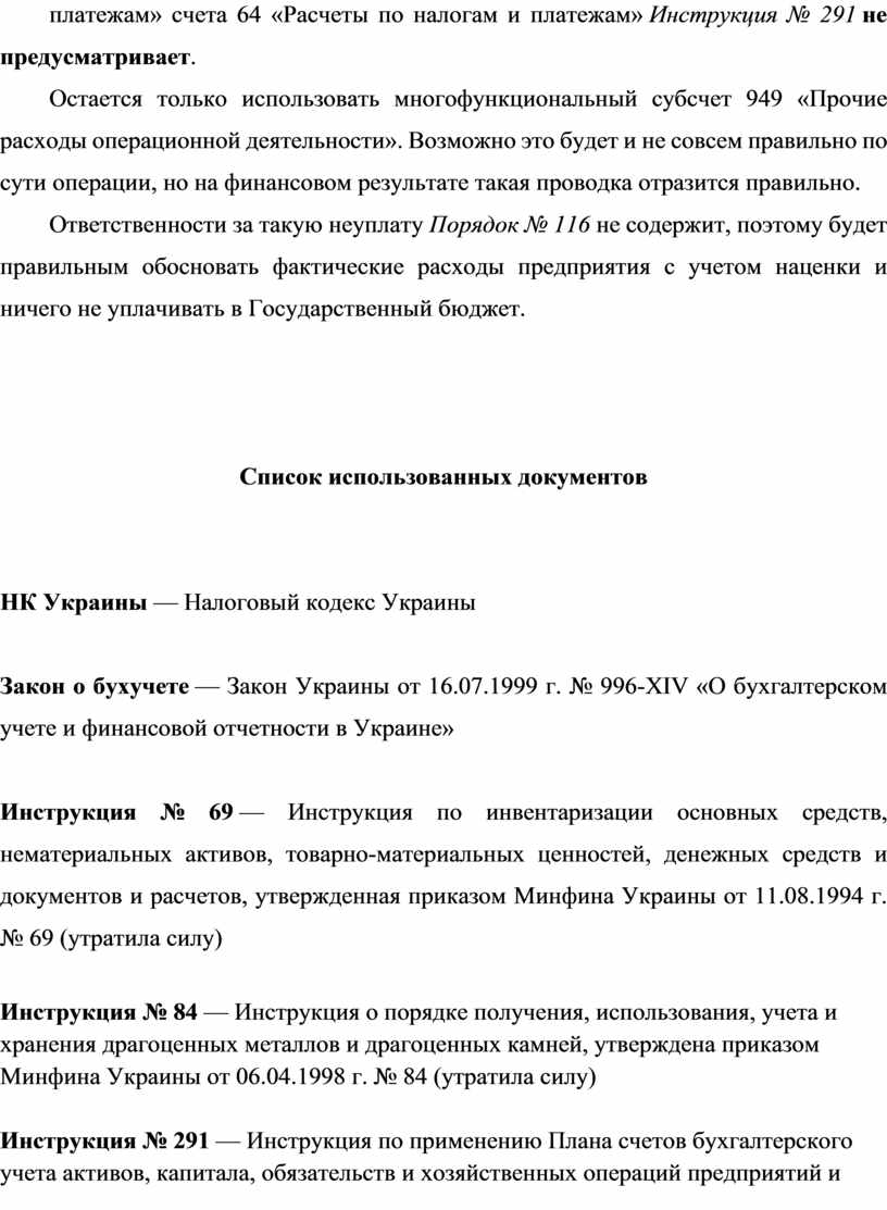 НК Украины — Налоговый кодекс Украины Закон о бухучете — Закон Украины от 16.07.1999 г. № 996-XIV«О бухгалтерском учете и финансовой отчетности в Украине» Инструкция № 69 — Инструкция по инвентаризации основных средств, нематериальных активов, товарно-материальных ценностей, денежных средств и документов и расчетов, утвержденная приказом Минфина Украины от 11.08.1994 г. № 69(утратила силу) Инструкция № 84 — Инструкция о порядке получения, использования, учета и хранения драгоценных металлов и драгоценных камней, утверждена приказом Минфина Украины от 06.04.1998 г. № 84 (утратила силу) Инструкция № 291 — Инструкция по применению Плана счетов бухгалтерского учета активов, капитала, обязательств и хозяйственных операций предприятий и организаций, утвержденная приказом Минфина Украины от 30.11.1999 г. № 291 Положение № 158 — Положение об инвентаризации имущества государственных предприятий, приватизируемых (корпоратизируемых), а также имущества государственных предприятий и организаций, передаваемых в аренду (возвращаемых после окончания срока действия договора аренды или его расторжения), утвержденное Постановлением КМУ от 02.03.1993 г. № 158 Положение № 637 — Положение о ведении кассовых операций в национальной валюте в Украине, утвержденное постановлением Правления НБУ от 15.12.2004 г. № 637 Положение № 879 — Положение об инвентаризации активов и обязательств, утвержденное приказом Минфина Украины от 02.09.2014 г. № 879 Порядок № 116 — Порядок определения размера убытков от хищений, недостачи, уничтожения (порчи), материальных ценностей, утвержденный Постановлением КМУ от 22.01.1996 г. № 116 Приказ 587 — Приказ Минфина Украины от 22.06.2015 г. № 587 «О признании такими, которые утратили силу, некоторых приказов Министерства финансов Украины» |