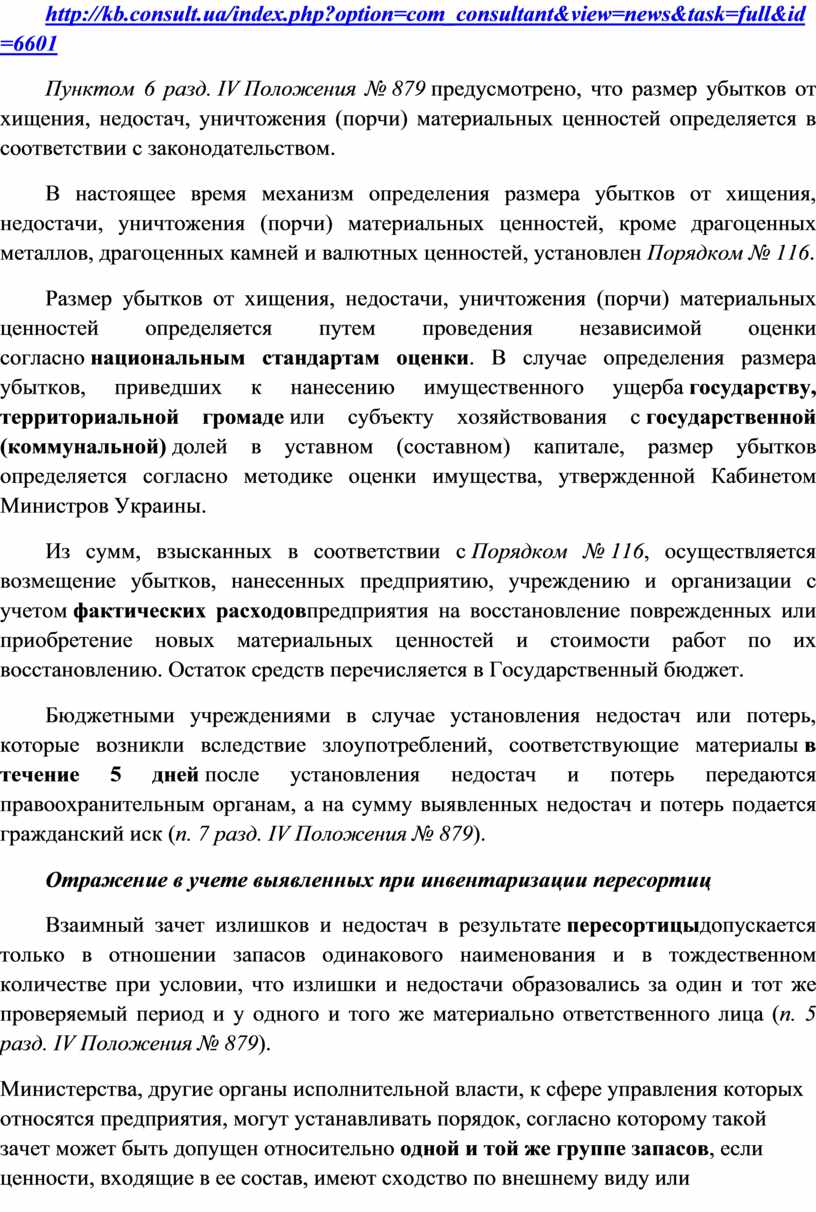 недостач, выявленных при инвентаризации Ведя речь об учете недостач запасов на забалансовом счете 072 «Невозмещенные недостачи и потери от порчи ценностей», Минфин Украины, к сожалению конкретного ответа на вопрос, куда же в балансе списать недостачи и порчу запасов в Положении № 879 не дает. Согласно Инструкции № 291 на субсчете 375 «Расчеты по возмещению причиненных убытков» ведется учет расчетов по возмещению предприятию причиненных убытков в результате недостач и потерь от порчи ценностей, недостач и хищения денежных средств, если виновный выявлен (установлен). Следовательно, учитывать на субсчете 375 недостачи и порчу активов при отсутствии виновных лиц некорректно. Видимо бухгалтерам придется и далее руководствоваться абзацем 2 пп. «б» п. 12.12 утратившей силу Инструкции № 69, согласно которому при отсутствии конкретных виновников пересортицы, суммовые разницы рассматриваются как недостачи ценностей сверх нормы естественной убыли с отнесением их в состав прочих расходов операционной деятельности. Уменьшение суммы невозмещенных недостач и потерь от порчи ценностей на субсчете 072 «Невозмещенные недостачи и потери от порчи ценностей» отражается после решения вопроса о виновниках с одновременными записями по дебету субсчета 375 «Расчеты по возмещению причиненных убытков» и кредиту субсчета 716 «Возмещение ранее списанных активов» в сумме, подлежащей возмещению виновниками. Пунктом 6 разд. IV Положения № 879 предусмотрено, что размер убытков от хищения, недостач, уничтожения (порчи) материальных ценностей определяется в соответствии с законодательством. В настоящее время