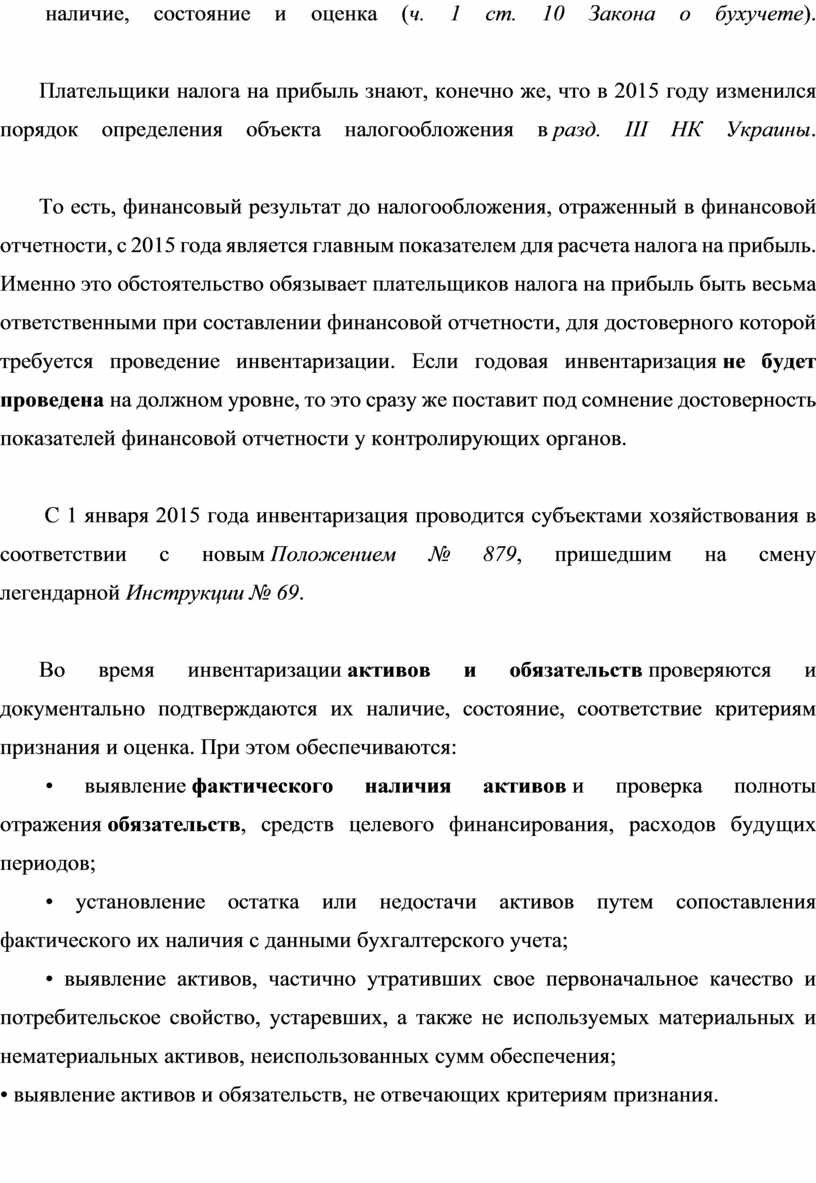 Вопрос сохранности материальных ценностей — актуальная тема не только для государственных предприятия, но и для частного бизнеса (коммерческих структур). Человечество не придумало более эффективного метода проверки имущества субъектов хозяйствования нежели инвентаризация. Инвентаризация — это проверка и документальное подтверждение наличия и состояния материальных и других ценностей, основных средств и взносов предприятий, расчетов и обязательств, сверка фактического наличия с данными бухгалтерского учета, урегулирование выявленных разниц и отражение результатов инвентаризации в учете. Для обеспечения достоверности данных бухгалтерского учета и финансовой отчетности предприятия обязаны проводить инвентаризацию активов и обязательств, во время которой проверяются и документально подтверждаются их наличие, состояние и оценка (ч. 1 ст. 10 Закона о бухучете). Плательщики налога на прибыль знают, конечно же, что в 2015 году изменился порядок определения объекта налогообложения в разд. III НК Украины. То есть, финансовый результат до налогообложения, отраженный в финансовой отчетности, с 2015 года является главным показателем для расчета налога на прибыль. Именно это обстоятельство обязывает плательщиков налога на прибыль быть весьма ответственными при составлении финансовой отчетности, для достоверного которой требуется проведение инвентаризации. Если годовая инвентаризация не будет проведена на должном уровне, то это сразу же поставит под сомнение достоверность показателей финансовой отчетности у контролирующих органов. С 1 января 2015 года инвентаризация проводится субъектами хозяйствования в соответствии с новым Положением № 879, пришедшим на смену легендарной Инструкции № 69. Во время инвентаризации активов и обязательств проверяются и документально подтверждаются их наличие, состояние, соответствие критериям признания и оценка. При этом обеспечиваются: • выявление фактического наличия активов и проверка полноты отражения обязательств, средств целевого финансирования, расходов будущих периодов; • установление остатка или недостачи активов путем сопоставления фактического их наличия с данными бухгалтерского учета; • выявление активов, частично утративших свое первоначальное качество и потребительское свойство, устаревших, а также не используемых материальных и нематериальных активов, неиспользованных сумм обеспечения; • выявление активов и обязательств, не отвечающих критериям признания. Сроки проведения инвентаризации на предприятиях Ответственность за организацию бухгалтерского учета и обеспечение фиксирования фактов осуществления всех хозяйственных операций в первичных документах, сохранение обработанных документов, регистров и отчетности в течение установленного срока, но не менее трех лет, несет собственник (собственники) или уполномоченный орган (должностное лицо), осуществляющий руководство предприятием согласно законодательству и учредительным документам (ч. 3 ст. 8 Закона о бухучете). В зависимости от значимости инвентаризации в жизнедеятельности субъекта хозяйствования, собственникомопределяется периодичность проведения инвентаризаций, как сплошных, так и выборочных. В новом Положении № 879несколько изменен подход к предельным срокам проведения годовой инвентаризации а