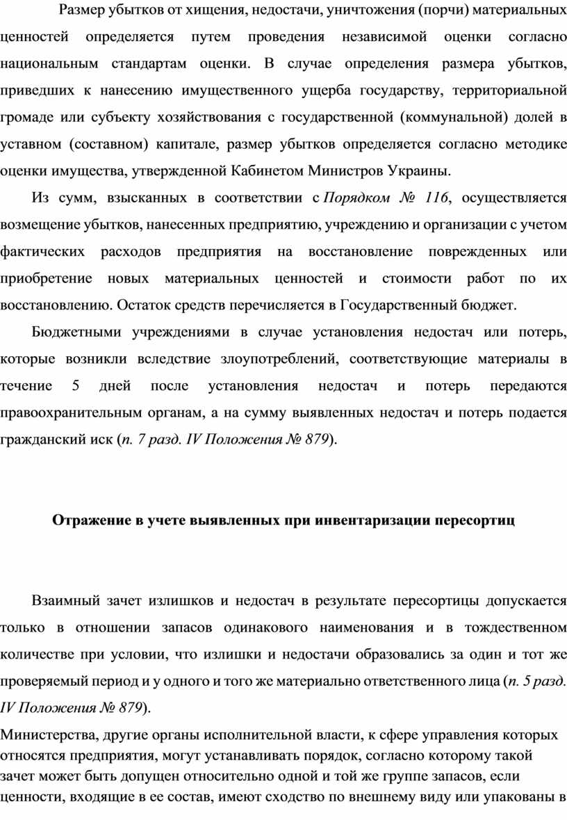 камней и валютных ценностей, установлен Порядком № 116. Из сумм, взысканных в соответствии с Порядком № 116, осуществляется возмещение убытков, нанесенных предприятию, учреждению и организации с учетом фактических расходов предприятия на восстановление поврежденных или приобретение новых материальных ценностей и стоимости работ по их восстановлению. Остаток средств перечисляется в Государственный бюджет. Бюджетными учреждениями в случае установления недостач или потерь, которые возникли вследствие злоупотреблений, соответствующие материалы в течение 5 дней после установления недостач и потерь передаются правоохранительным органам, а на сумму выявленных недостач и потерь подается гражданский иск (п. 7 разд. IV Положения № 879).