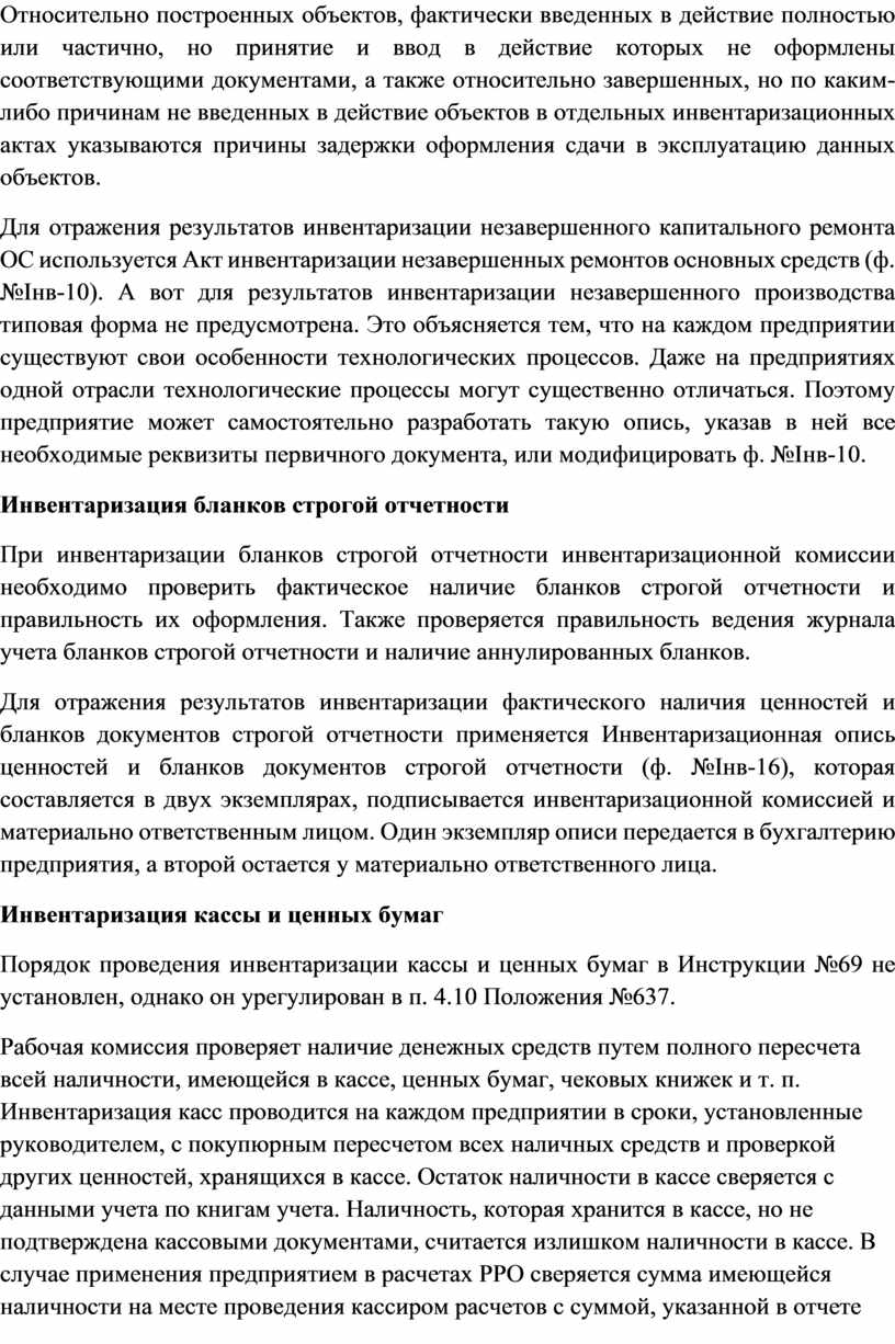 Типовых форм для оформления данных инвентаризации активов и обязательств на сегодняшний день нет. Поэтому, руководствуясь п. 14 Положения № 879, субъекты хозяйствования оформляют инвентаризационные описи, акты инвентаризации, сличительные ведомости в соответствии с требованиями, установленными Положением № 88, для первичных документов с учетом обязательных реквизитов и требований, предусмотренных настоящим Положением. Материалы инвентаризации могут быть заполнены как рукописным способом, так и с помощью электронных средств обработки информации. В то же время никто не запрещает субъектам хозяйствования доработать формы инвентаризационных описей, утвержденных нормативными документами бывшего СССР и дополнить их необходимыми реквизитами. Исключение — инвентаризация кассы на предприятии, которая должна проводиться и оформляться согласно Положению № 637 (абзац 2 пп. 6.1 п. 6 разд. III Положения № 879). В разд. III «Порядок инвентаризации активов и обязательств» Положения № 879 определены особенности проведения инвентаризации: • основных средств (п. 1 разд. III Положения № 879); • нематериальных активов (п. 2 разд. III Положения № 879); • незавершенных капитальных инвестиций (п. 3 разд. III Положения № 879); • запасов (п. 4 разд. III Положения № 879); • биологических активов (п. 5 разд. III Положения № 879); • наличных, денежных средств и их эквивалентов, бланков документов строгой отчетности (п. 6 разд. III Положения № 879); • дебиторской и кредиторской задолженностей (п. 7 разд. III Положения № 879); • расходов и доходов будущих периодов, обеспечений и резервов (п. 8 разд. III Положения № 879).