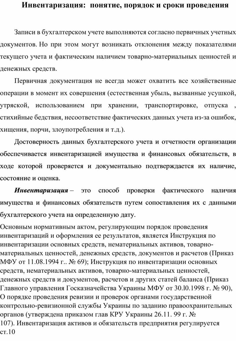 Основным нормативным актом, регулирующим порядок проведения инвентаризаций и оформления ее результатов, является Инструкция по инвентаризации основных средств, нематериальных активов, товарно-материальных ценностей, денежных средств, документов и расчетов (Приказ МФУ от 11.08.1994 г.. № 69); Инструкция по инвентаризации основных средств, нематериальных активов, товарно-материальных ценностей, денежных средств и документов, расчетов и других статей баланса (Приказ Главного управления Госказначейства Украины МФУ от 30.l0.1998 г. № 90), О порядке проведения ревизии и проверок органами государственной контрольно-ревизионной службы Украины по заданию правоохранительных органов (утверждена приказом глав КРУ Украины 26.11. 99 г. № 107). Инвентаризация активов и обязательств предприятия регулируется ст.10 ЗУ "О бухгалтерском учете и финансовой отчетности в Украине", согласно которой проверяются и документально подтверждаются их наличие и состояние.