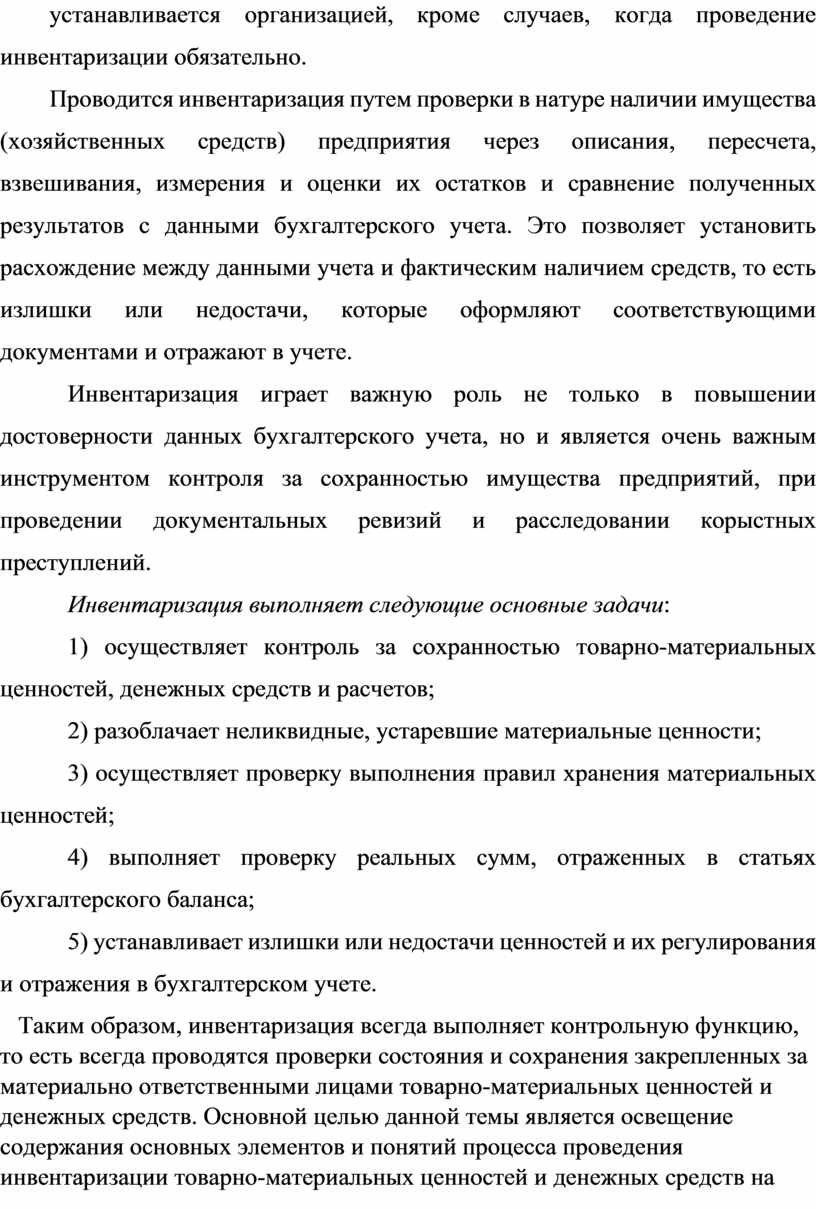 Таким образом, инвентаризация всегда выполняет контрольную функцию, то есть всегда проводятся проверки состояния и сохранения закрепленных за материально ответственными лицами товарно-материальных ценностей и денежных средств. Основной целью данной темы является освещение содержания основных элементов и понятий процесса проведения инвентаризации товарно-материальных ценностей и денежных средств на предприятии, организации или учреждении, а также способов искажения результатов инвентаризации и методов их обнаружения.