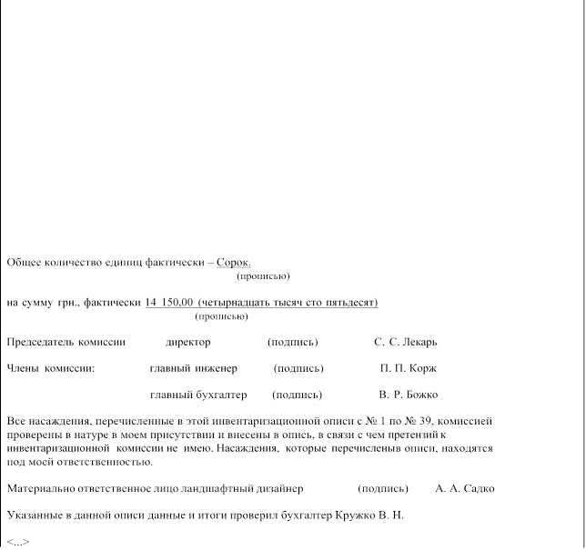 При инвентаризации составляются отдельные инвентаризационные описи в разрезе мест нахождения многолетних насаждений и материально ответственных лиц. В описях указывают: вид насаждения, ботанический сорт, год и площадь посадки, количество деревьев (кустарников) и их балансовую стоимость (п. 2.13 Методрекомендаций № 37).