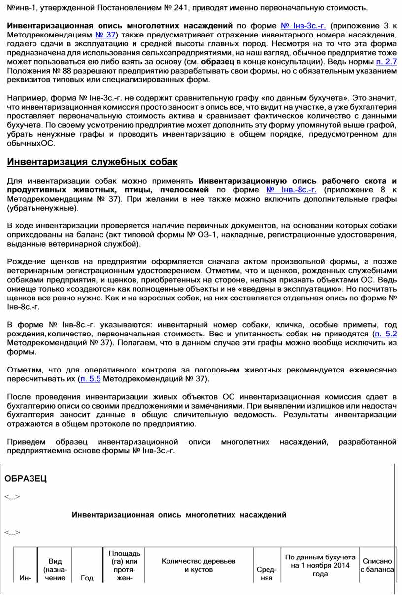 Инвентаризационная опись многолетних насаждений по форме № Інв-3с.-г. (приложение 3 к Методрекомендациям № 37) также предусматривает отражение инвентарного номера насаждения, года его сдачи в эксплуатацию и средней высоты главных пород. Несмотря на то что эта форма предназначена для использования сельхозпредприятиями, на наш взгляд, обычное предприятие тоже может пользоваться ею либо взять за основу (см. образец в конце консультации). Ведь нормы п. 2.7 Положения № 88 разрешают предприятию разрабатывать свои формы, но с обязательным указанием реквизитов типовых или специализированных форм.