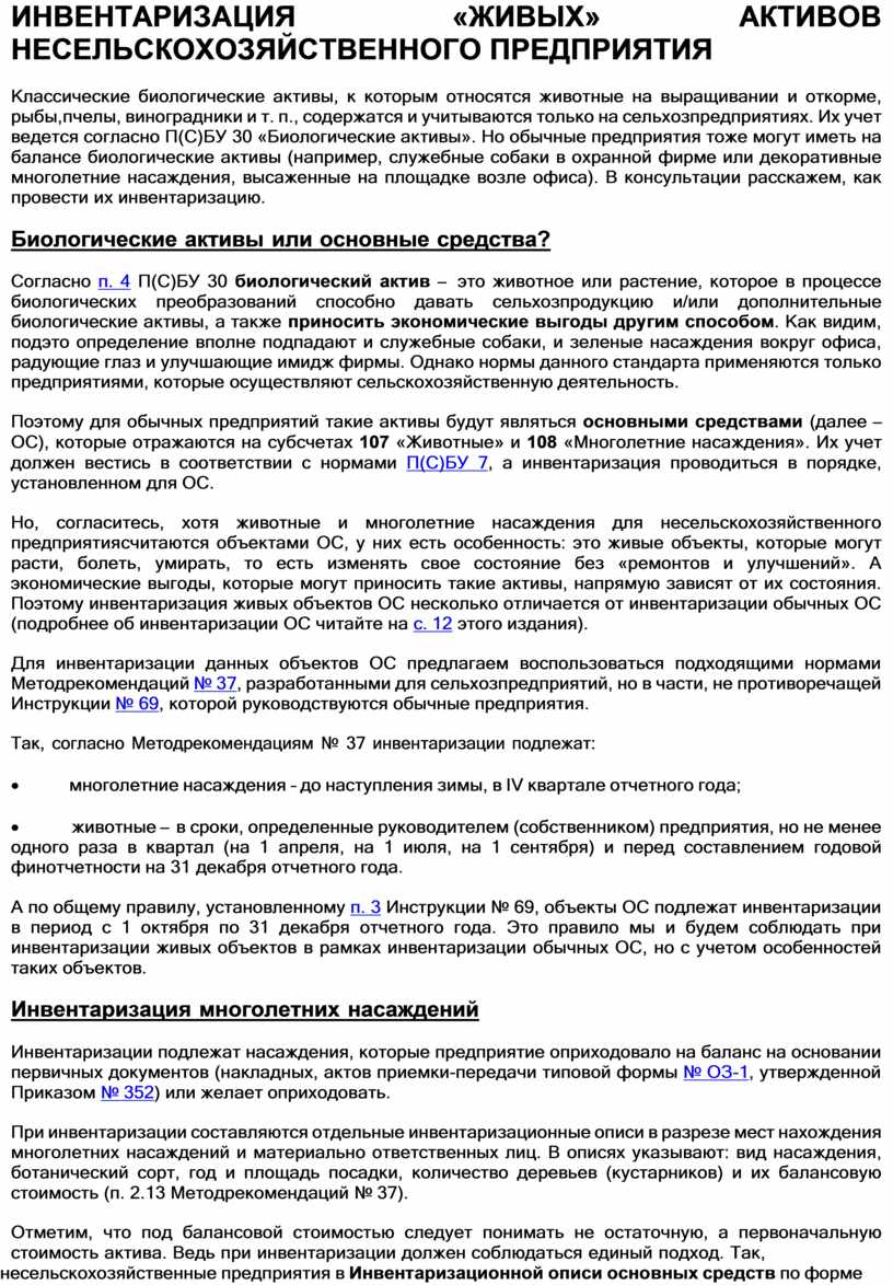 Но, согласитесь, хотя животные и многолетние насаждения для несельскохозяйственного предприятия считаются объектами ОС, у них есть особенность: это живые объекты, которые могут расти, болеть, умирать, то есть изменять свое состояние без «ремонтов и улучшений». А экономические выгоды, которые могут приносить такие активы, напрямую зависят от их состояния. Поэтому инвентаризация живых объектов ОС несколько отличается от инвентаризации обычных ОС (подробнее об инвентаризации ОС читайте на с. 12 этого издания).