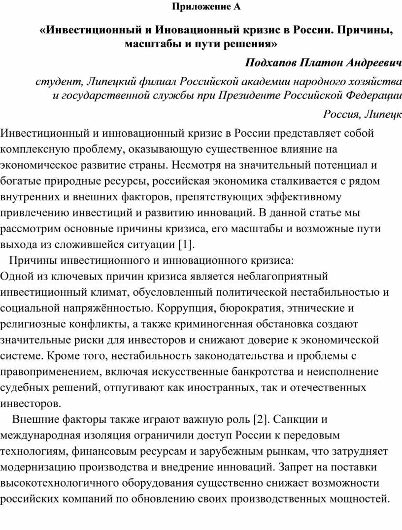 «Инвестиционный и Иновационный кризис в России. Причины, масштабы и пути решения»