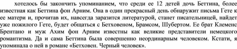 Как там было на самом деле, мы не знаем, возможно, образ Лотты получился из сложения черт двух реально живущих женщин. Что же до Максимилианы, рассказ о ней хотелось бы закончить упоминанием, что среди ее 12 детей дочь Беттина, более известная как Беттина фон Арним. Она в один прекрасный день обнаружит письма Гете к ее матери и, прочитав их, навсегда заразится литературой, станет писательницей, найдет уже пожилого Гете, будет общаться с Бетховеном, Брамсом, Шубертом. Ее брат Клеменс Брентано и муж Ахим фон Арним известны как великие представители немецкого романтизма. Да и сама Беттина была совершенно неординарным человеком. Кстати, я упоминала о ней в романе «Бетховен. Черный человек».