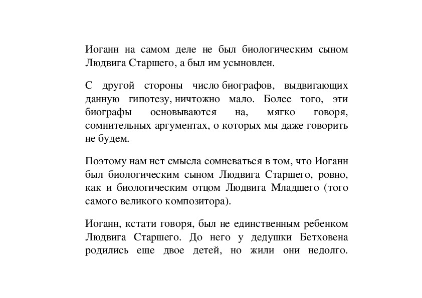 Поэтому нам нет смысла сомневаться в том, что Иоганн был биологическим сыном Людвига Старшего, ровно, как и биологическим отцом Людвига Младшего (того самого великого композитора).