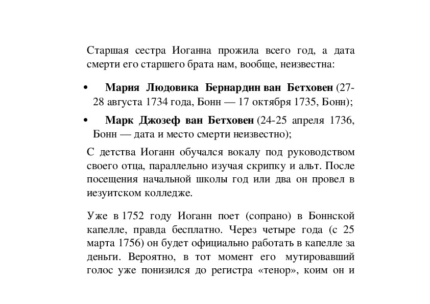 Уже в 1752 году Иоганн поет (сопрано) в Боннской