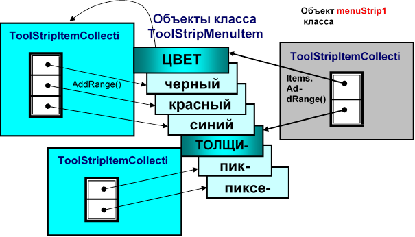 ЦВЕТ.DropDownItems.AddRange (new ToolStripItem[ ] { черный, красный, синий } );