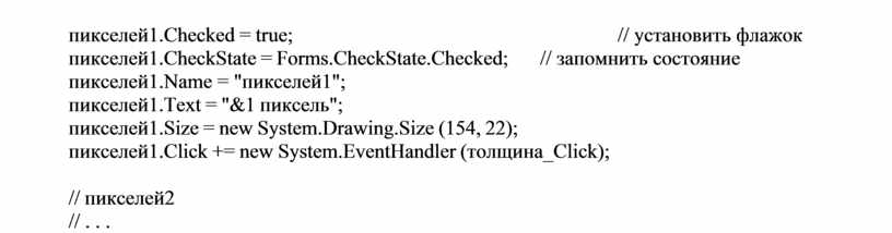 пикселей1.Checked = true; // установить флажок пикселей1.CheckState = Forms.CheckState.Checked; // запомнить состояние пикселей1.Name = "пикселей1";