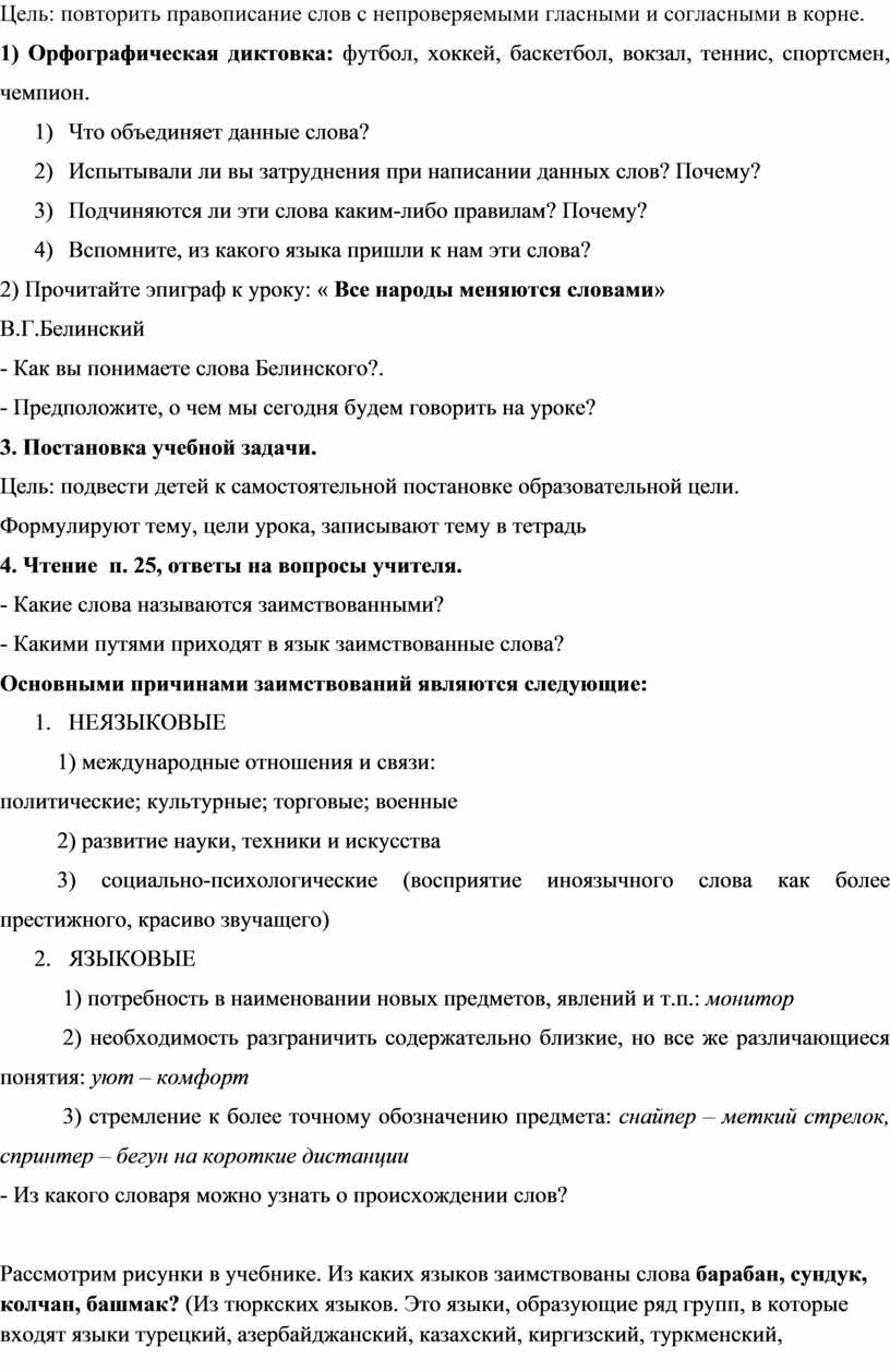 Рассмотрим рисунки в учебнике. Из каких языков заимствованы слова барабан, сундук, колчан, башмак? (Из тюркских языков. Это языки, образующие ряд групп, в которые входят языки турецкий, азербайджанский, казахский, киргизский, туркменский, узбекский, кара-калпакский, уйгурский, татарский, башкирский, чувашский, балкарский, карачаевский, кумыкский, ногайский, тувинский, хакасский, якутский и др. К мертвым относятся языки половецкий, хазарский, булгарский и др.)