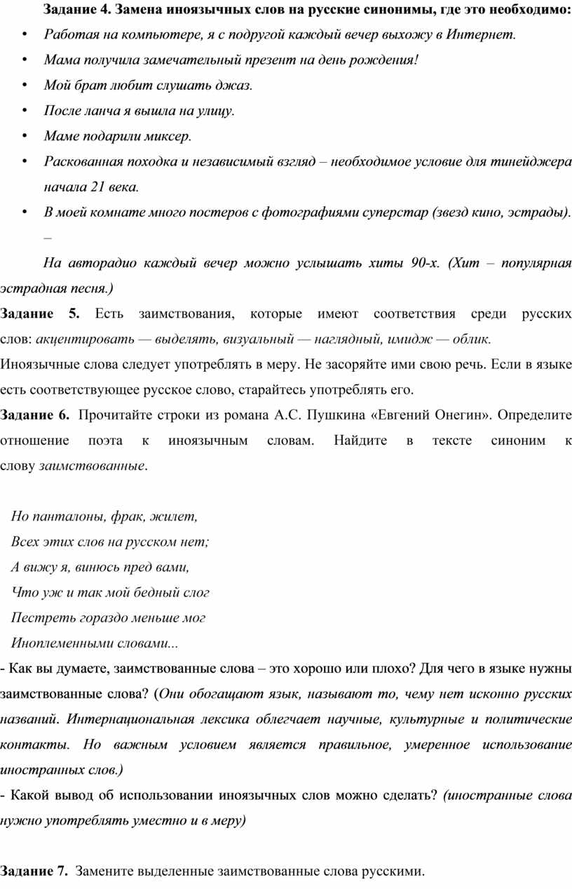 Задание 6. Прочитайте строки из романа А.С. Пушкина «Евгений Онегин». Определите отношение поэта к иноязычным словам. Найдите в тексте синоним к слову заимствованные.