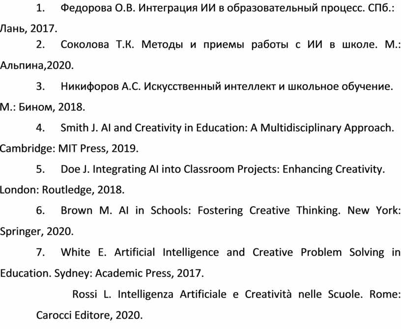 1. Кузяков Я. Искусственный интеллект и креативное мышление в образовании. М.: Наука, 2022.