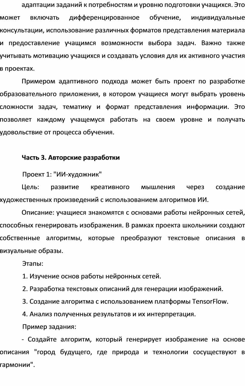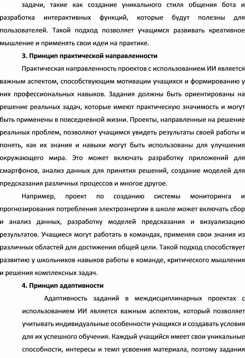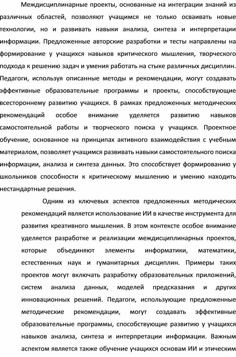 Одним из ключевых аспектов предложенных методических рекомендаций является использование ИИ в качестве инструмента для развития креативного мышления. В этом контексте особое внимание уделяется разработке и реализации междисциплинарных проектов, которые объединяют элементы информатики, математики, естественных наук и гуманитарных дисциплин. Примеры таких проектов могут включать разработку образовательных приложений, систем анализа данных, моделей предсказания и других инновационных решений. Педагоги, использующие предложенные методические рекомендации, могут создавать эффективные образовательные программы, способствующие развитию у учащихся навыков анализа, синтеза и интерпретации информации. Важным аспектом является также обучение учащихся основам ИИ и этическим принципам его использования. Это помогает формировать у школьников ответственное отношение к технологиям и понимание важности этического использования ИИ в различных сферах жизни.
