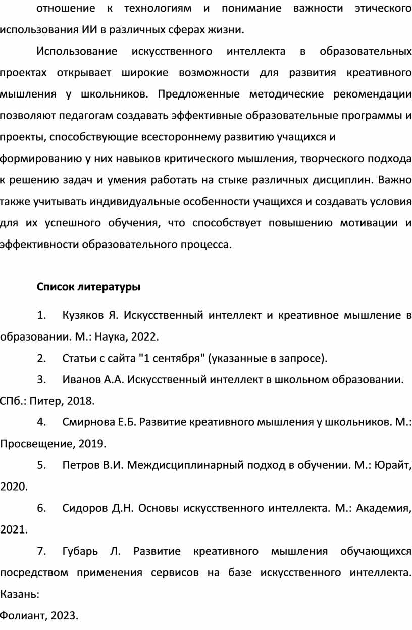 7. Губарь Л. Развитие креативного мышления обучающихся посредством применения сервисов на базе искусственного интеллекта. Казань: