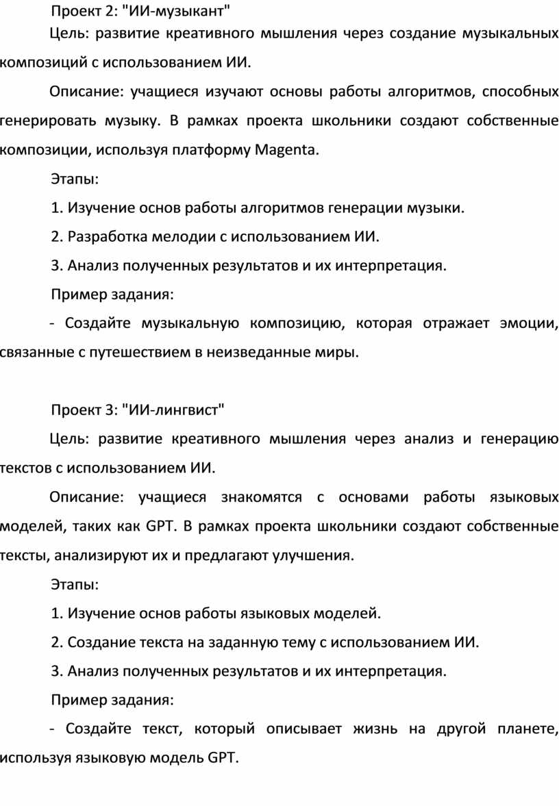 Использование искусственного интеллекта в образовательных проектах открывает широкие возможности для развития креативного мышления у школьников. Предложенные методические рекомендации позволяют педагогам создавать эффективные образовательные программы и проекты, способствующие всестороннему развитию учащихся и