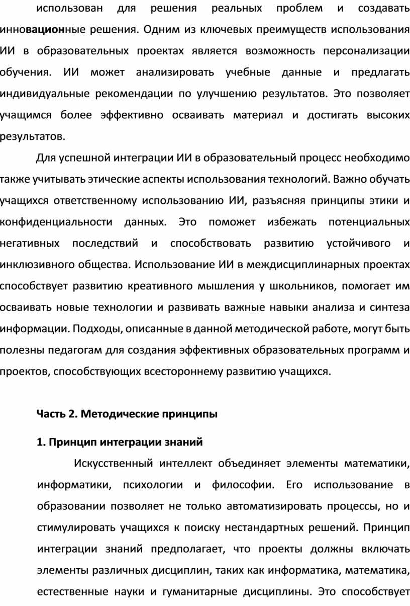 Для успешной интеграции ИИ в образовательный процесс необходимо также учитывать этические аспекты использования технологий. Важно обучать учащихся ответственному использованию ИИ, разъясняя принципы этики и конфиденциальности данных. Это поможет избежать потенциальных негативных последствий и способствовать развитию устойчивого и инклюзивного общества. Использование ИИ в междисциплинарных проектах способствует развитию креативного мышления у школьников, помогает им осваивать новые технологии и развивать важные навыки анализа и синтеза информации. Подходы, описанные в данной методической работе, могут быть полезны педагогам для создания эффективных образовательных программ и проектов, способствующих всестороннему развитию учащихся.