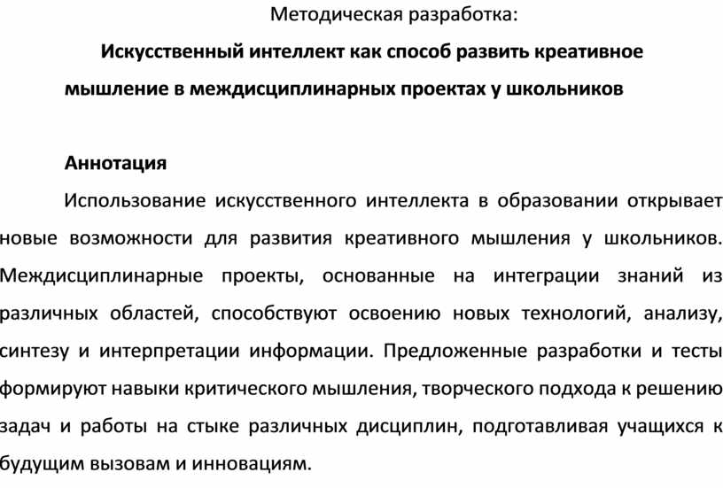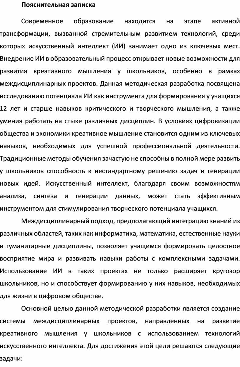 Современное образование находится на этапе активной трансформации, вызванной стремительным развитием технологий, среди которых искусственный интеллект (ИИ) занимает одно из ключевых мест. Внедрение ИИ в образовательный процесс открывает новые возможности для развития креативного мышления у школьников, особенно в рамках междисциплинарных проектов. Данная методическая разработка посвящена исследованию потенциала ИИ как инструмента для формирования у учащихся 12 лет и старше навыков критического и творческого мышления, а также умения работать на стыке различных дисциплин. В условиях цифровизации общества и экономики креативное мышление становится одним из ключевых навыков, необходимых для успешной профессиональной деятельности. Традиционные методы обучения зачастую не способны в полной мере развить у школьников способность к нестандартному решению задач и генерации новых идей. Искусственный интеллект, благодаря своим возможностям анализа, синтеза и генерации данных, может стать эффективным инструментом для стимулирования творческого потенциала учащихся.