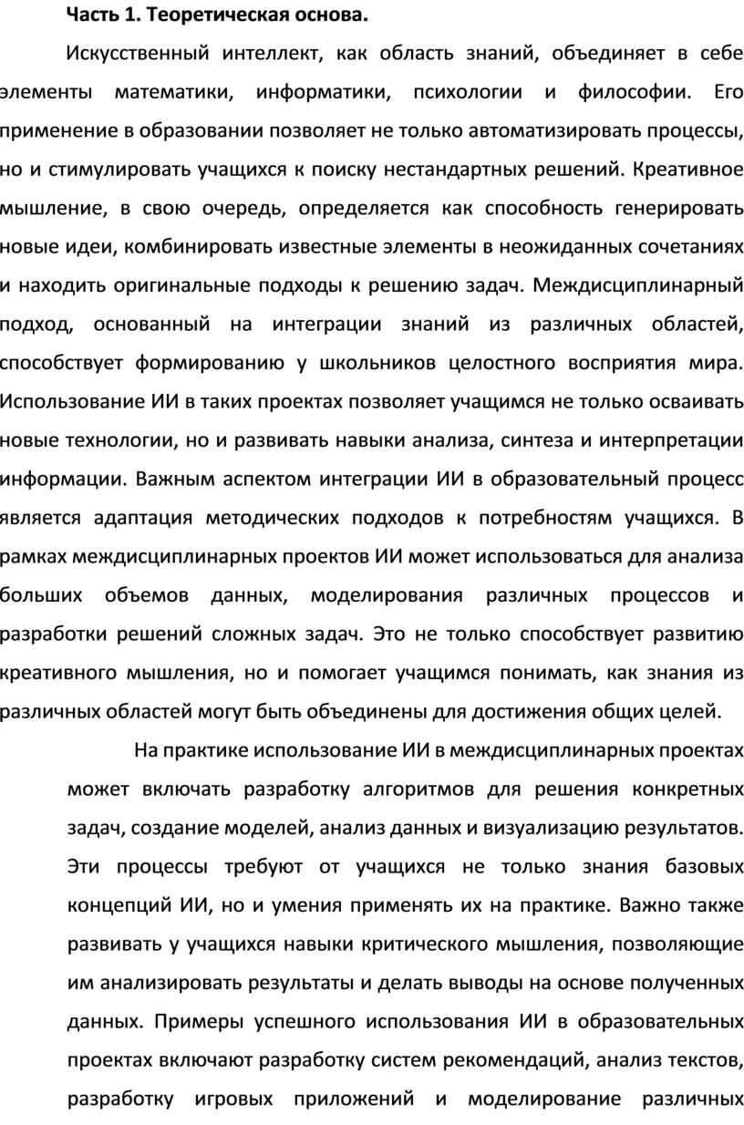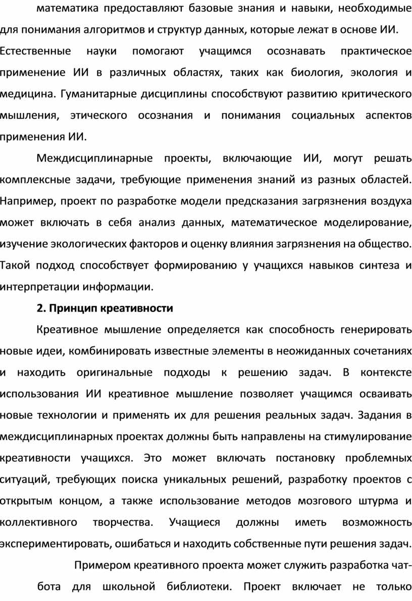 Междисциплинарный подход, предполагающий интеграцию знаний из различных областей, таких как информатика, математика, естественные науки и гуманитарные дисциплины, позволяет учащимся формировать целостное восприятие мира и развивать навыки работы с комплексными задачами. Использование ИИ в таких проектах не только расширяет кругозор школьников, но и способствует формированию у них навыков, необходимых для жизни в цифровом обществе.