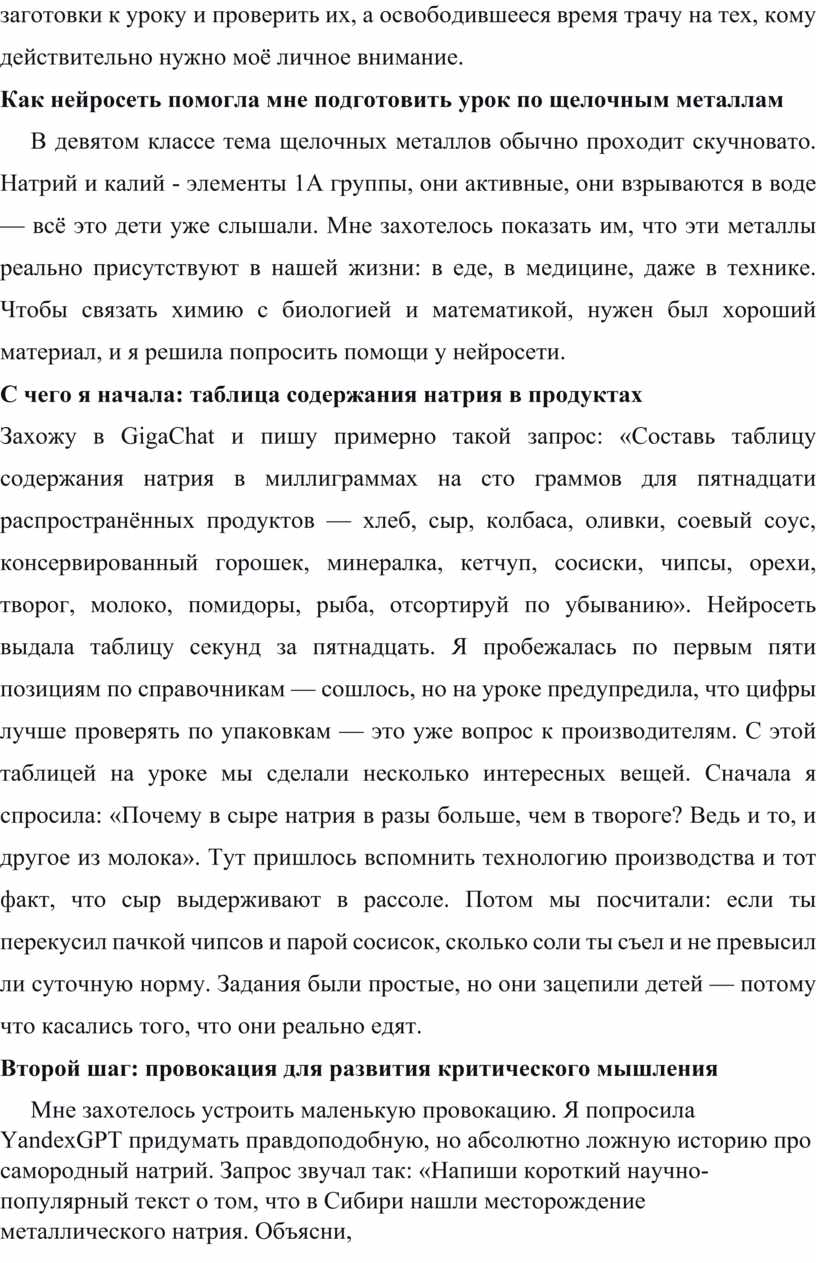 В девятом классе тема щелочных металлов обычно проходит скучновато. Натрий и калий - элементы 1А группы, они активные, они взрываются в воде — всё это дети уже слышали. Мне захотелось показать им, что эти металлы реально присутствуют в нашей жизни: в еде, в медицине, даже в технике. Чтобы связать химию с биологией и математикой, нужен был хороший материал, и я решила попросить помощи у нейросети.