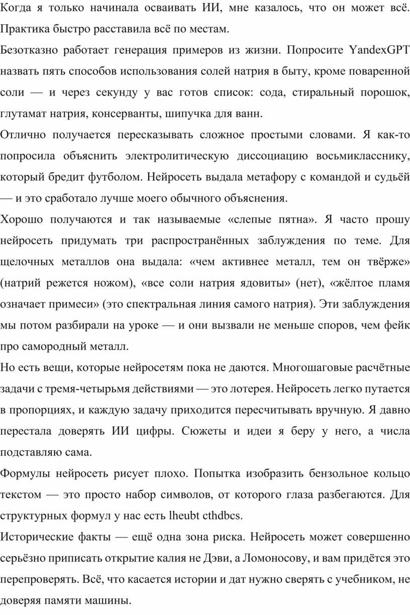 И ещё одно важное правило: никогда не показывайте детям сырой, неотредактированный текст. Как только они поймут, что учитель тоже пользуется нейросетью, возникнет соблазн решить, что можно вообще ничего не учить — спишет машина. ИИ — это мой черновик, моя заготовка. На урок я приношу только то, что прошло через мои руки и голову.