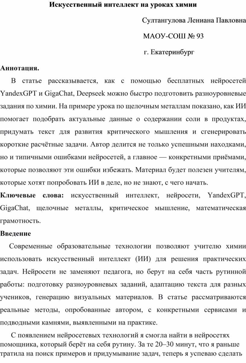 Ключевые слова: искусственный интеллект, нейросети, YandexGPT, GigaChat, щелочные металлы, критическое мышление, математическая грамотность.