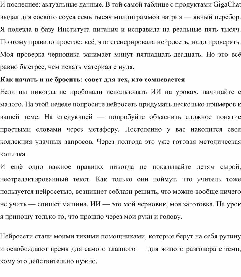 И последнее: актуальные данные. В той самой таблице с продуктами GigaChat выдал для соевого соуса семь тысяч миллиграммов натрия — явный перебор. Я полезла в базу Института питания и исправила на реальные пять тысяч. Поэтому правило простое: всё, что сгенерировала нейросеть, надо проверять. Моя проверка черновика занимает минут пятнадцать‑двадцать. Но это всё равно быстрее, чем искать материал с нуля.