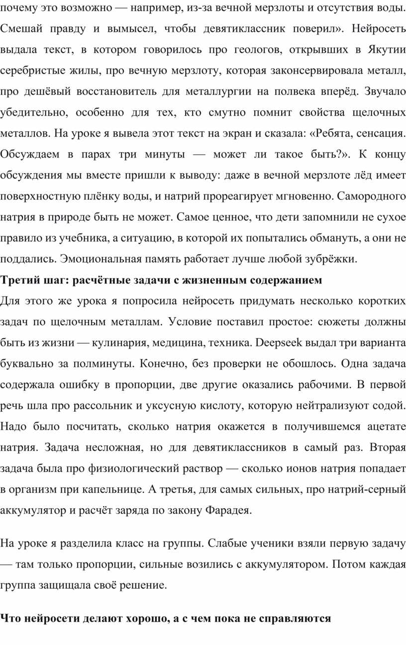 Мне захотелось устроить маленькую провокацию. Я попросила YandexGPT придумать правдоподобную, но абсолютно ложную историю про самородный натрий. Запрос звучал так: «Напиши короткий научно-популярный текст о том, что в Сибири нашли месторождение металлического натрия. Объясни, почему это возможно — например, из-за вечной мерзлоты и отсутствия воды. Смешай правду и вымысел, чтобы девятиклассник поверил». Нейросеть выдала текст, в котором говорилось про геологов, открывших в Якутии серебристые жилы, про вечную мерзлоту, которая законсервировала металл, про дешёвый восстановитель для металлургии на полвека вперёд. Звучало убедительно, особенно для тех, кто смутно помнит свойства щелочных металлов. На уроке я вывела этот текст на экран и сказала: «Ребята, сенсация. Обсуждаем в парах три минуты — может ли такое быть?». К концу обсуждения мы вместе пришли к выводу: даже в вечной мерзлоте лёд имеет поверхностную плёнку воды, и натрий прореагирует мгновенно. Самородного натрия в природе быть не может. Самое ценное, что дети запомнили не сухое правило из учебника, а ситуацию, в которой их попытались обмануть, а они не поддались. Эмоциональная память работает лучше любой зубрёжки.