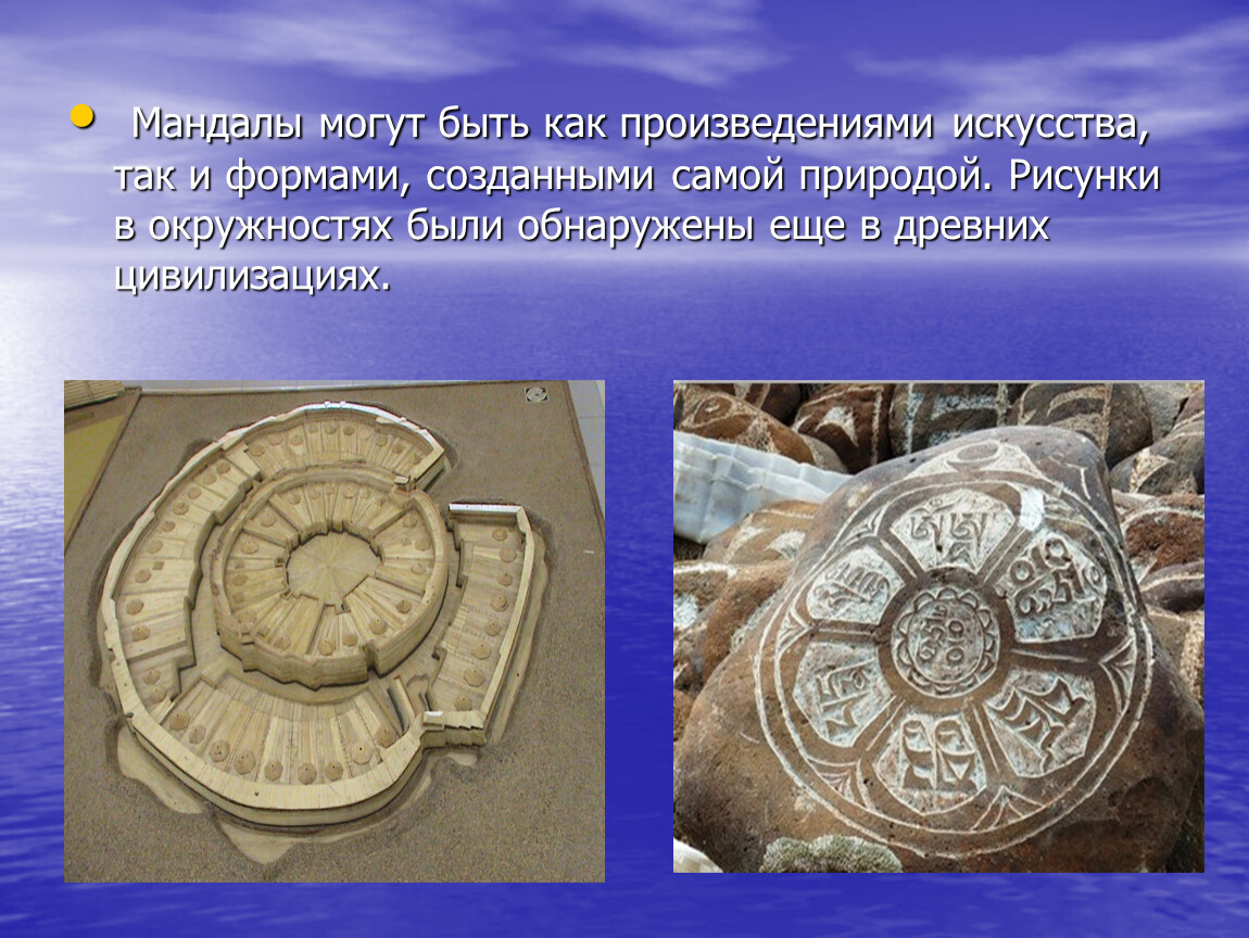 Мандалы могут быть как произведениями искусства, так и формами, созданными самой природой. Рисунки в окружностях были обнаружены еще в древних цивилизациях.