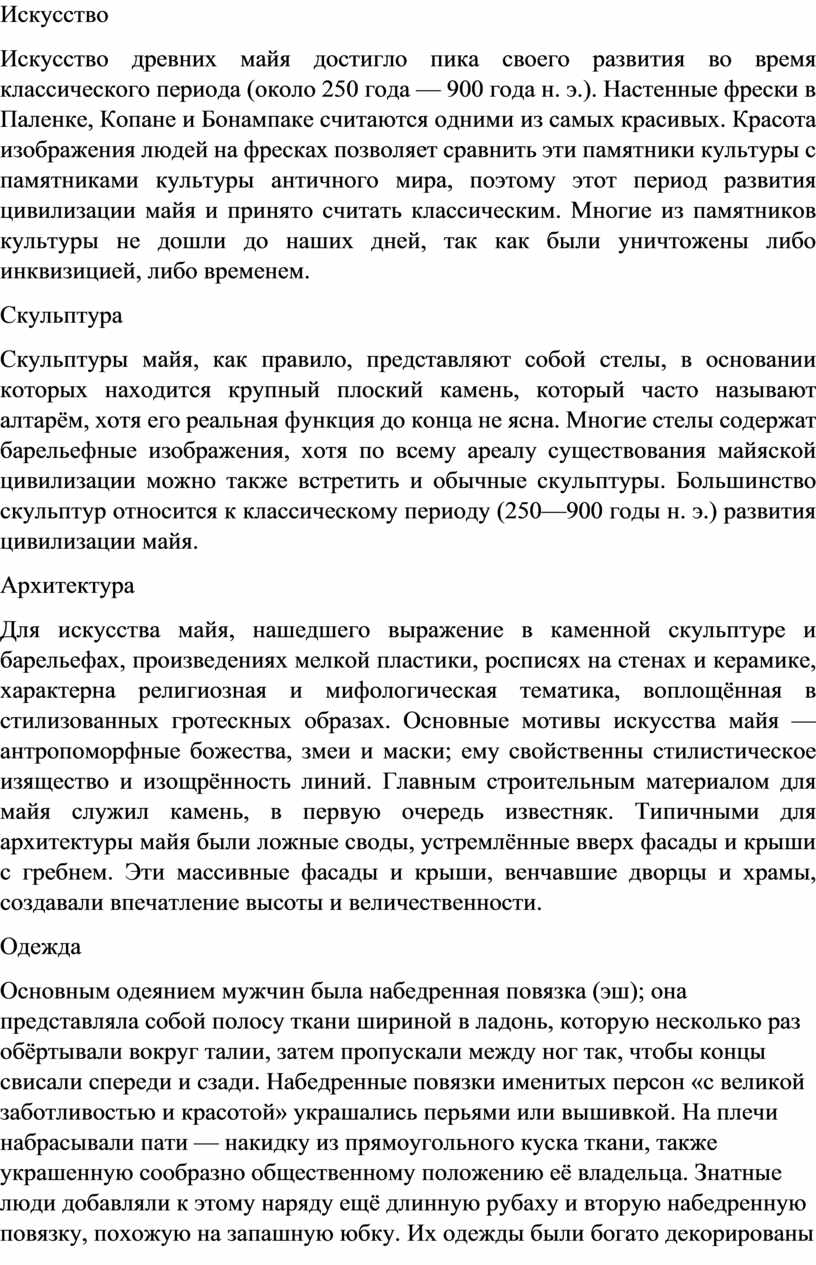 Для искусства майя, нашедшего выражение в каменной скульптуре и барельефах, произведениях мелкой пластики, росписях на стенах и керамике, характерна религиозная и мифологическая тематика, воплощённая в стилизованных гротескных образах. Основные мотивы искусства майя — антропоморфные божества, змеи и маски; ему свойственны стилистическое изящество и изощрённость линий. Главным строительным материалом для майя служил камень, в первую очередь известняк. Типичными для архитектуры майя были ложные своды, устремлённые вверх фасады и крыши с гребнем. Эти массивные фасады и крыши, венчавшие дворцы и храмы, создавали впечатление высоты и величественности.