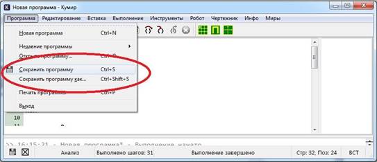 Текст программы сохраните в виде файла с расширением *.kum так, как показано на картинке ниже.