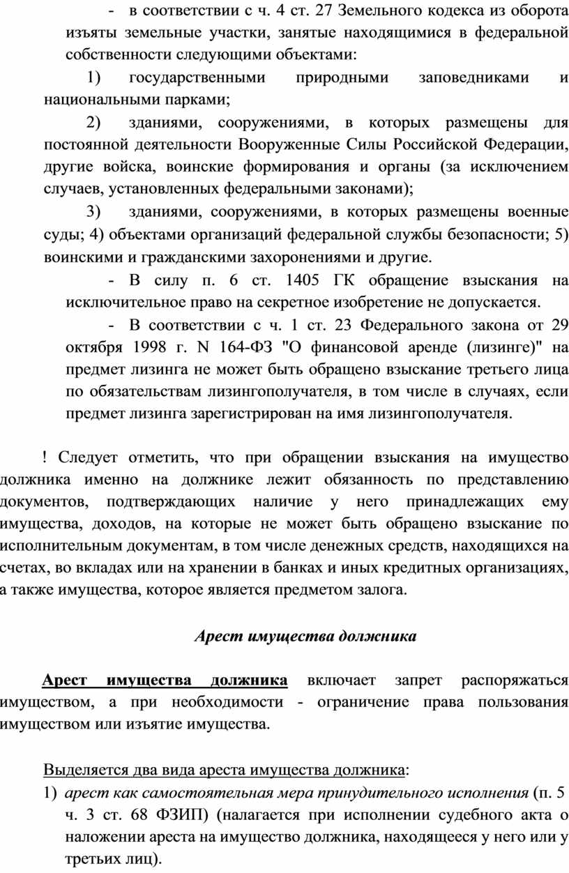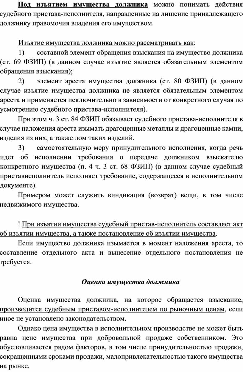 1) составной элемент обращения взыскания на имущество должника (ст. 69 ФЗИП) (в данном случае изъятие является обязательным элементом обращения взыскания);