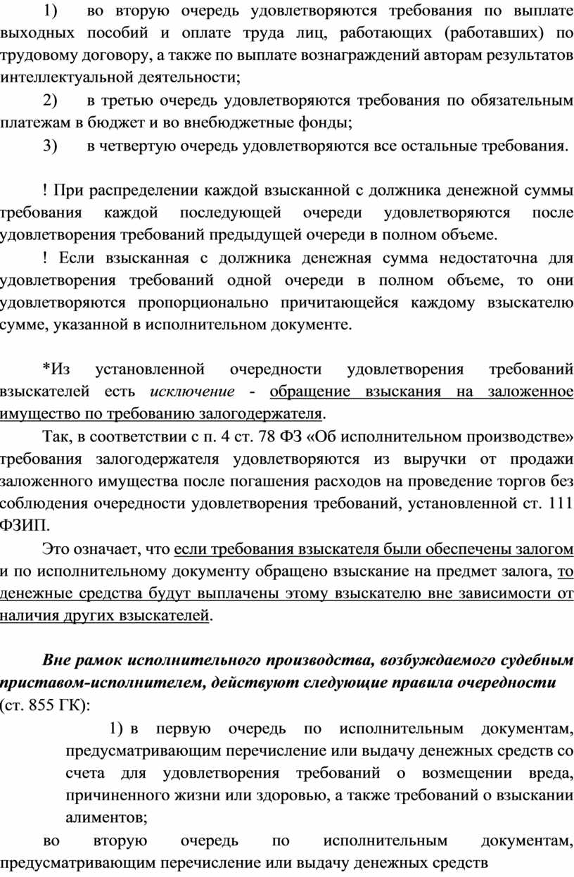 Вне рамок исполнительного производства, возбуждаемого судебным приставом-исполнителем, действуют следующие правила очередности