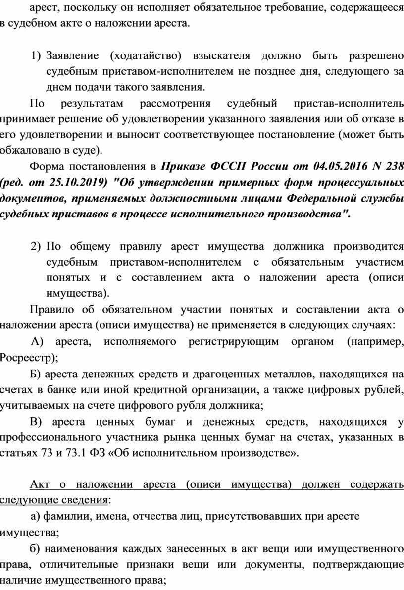 3) По общему правилу арест имущества должника производится судебным приставом-исполнителем с обязательным участием понятых и с составлением акта о наложении ареста (описи имущества).