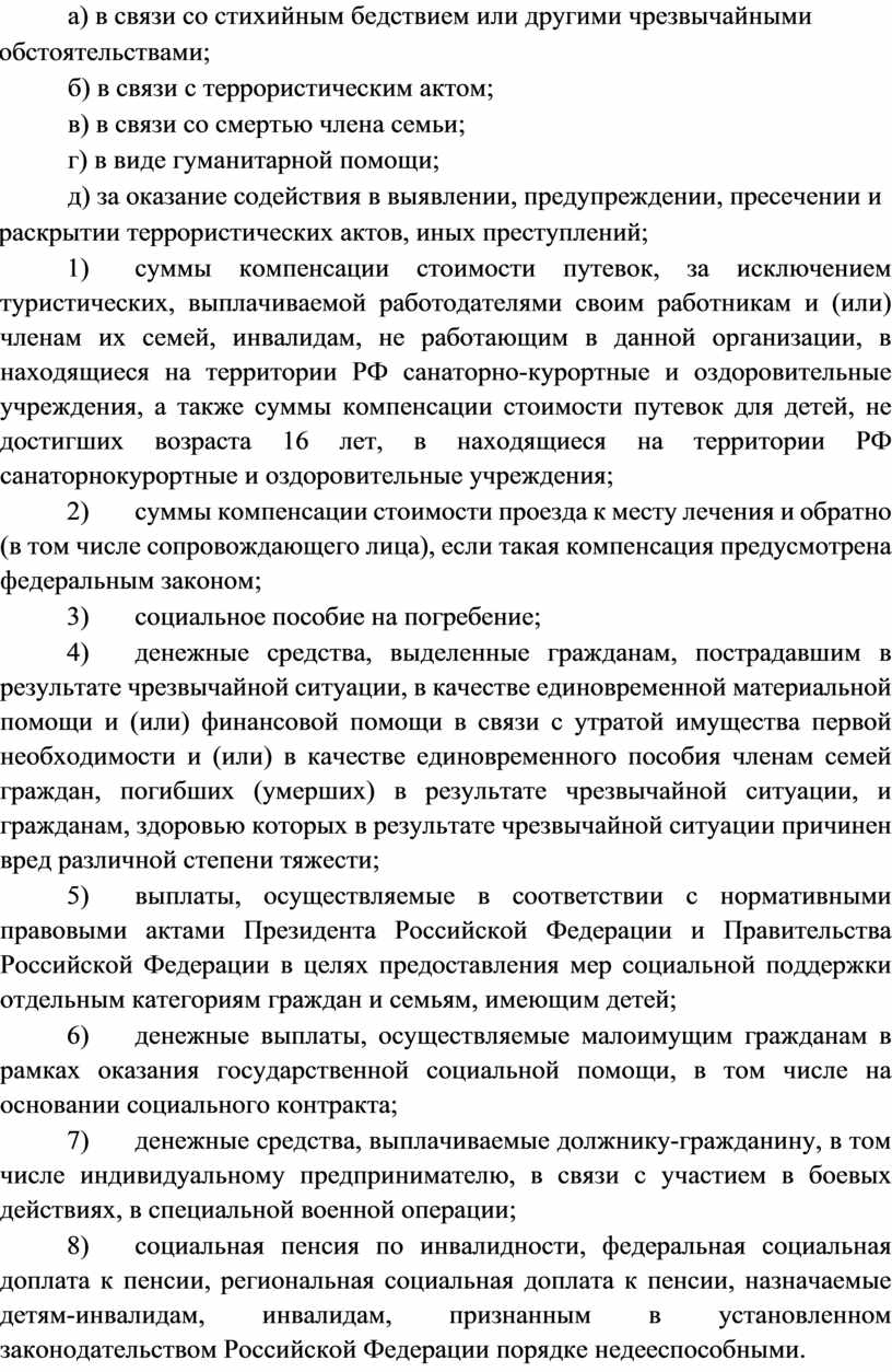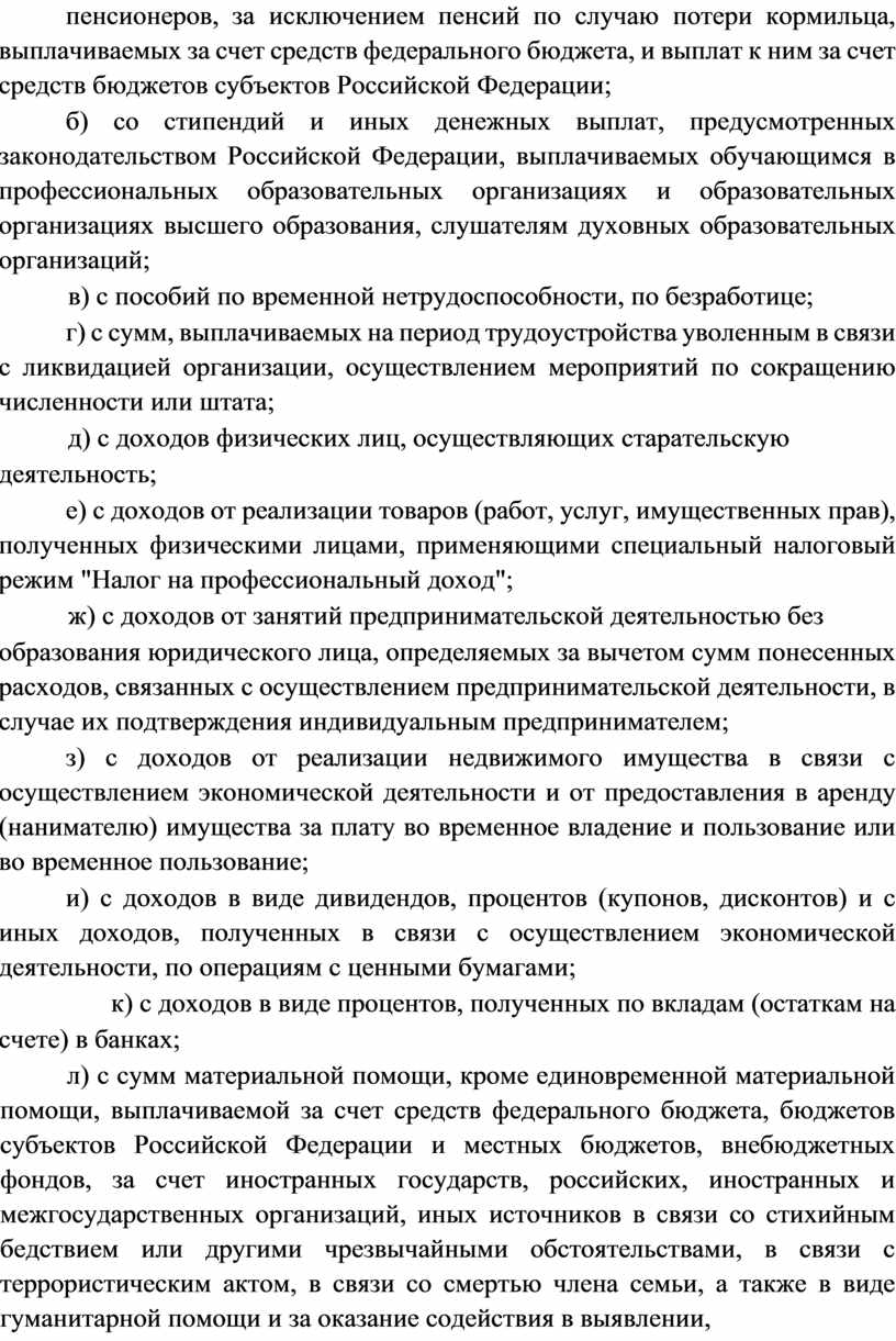 л) с сумм материальной помощи, кроме единовременной материальной помощи, выплачиваемой за счет средств федерального бюджета, бюджетов субъектов Российской Федерации и местных бюджетов, внебюджетных фондов, за счет иностранных государств, российских, иностранных и межгосударственных организаций, иных источников в связи со стихийным бедствием или другими чрезвычайными обстоятельствами, в связи с террористическим актом, в связи со смертью члена семьи, а также в виде гуманитарной помощи и за оказание содействия в выявлении, предупреждении, пресечении и раскрытии террористических актов, иных преступлений;